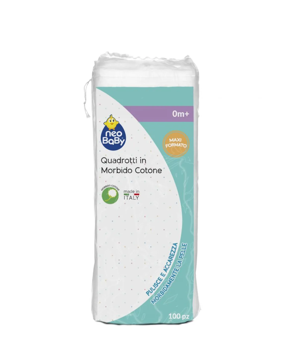 I quadrotti in morbido cotone accarezzano dolcemente la pelle del bambino rimuovendo ogni impurità.