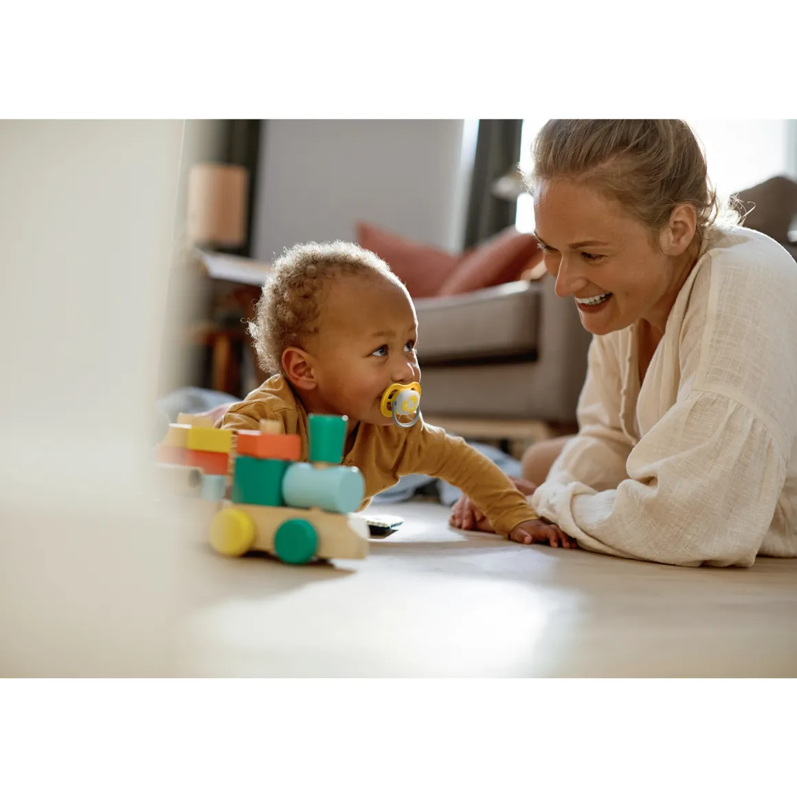 Ciuccio leggero e traspirante. Confezione da 2 succhietti con tettarella simmetrica ortodontica senza BPA.