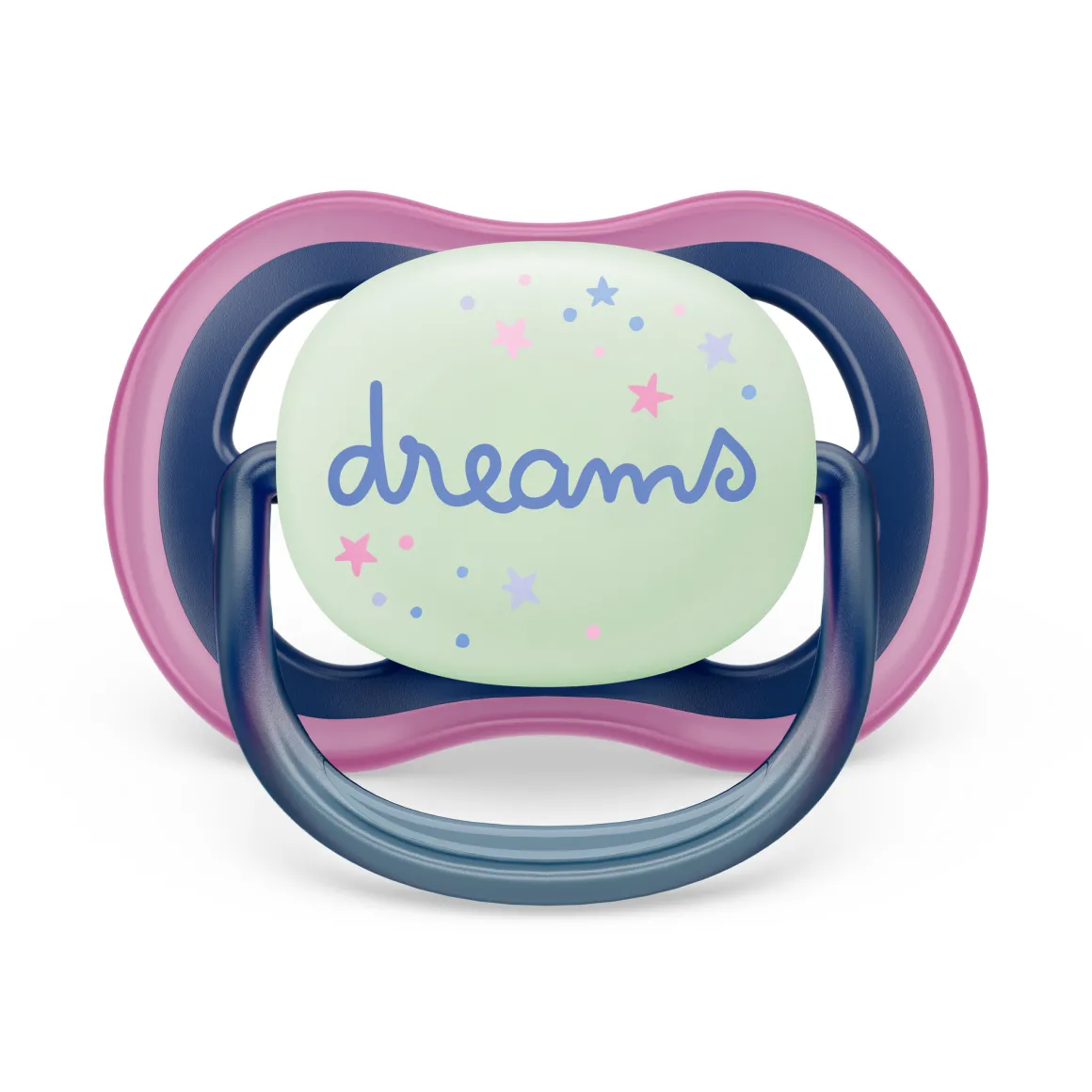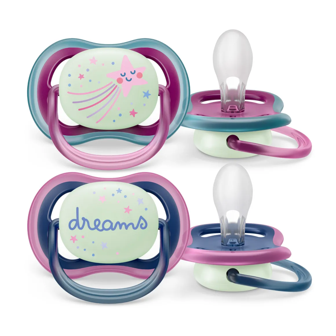 Calma il tuo bambino con il comfort dell’aria. Il ciuccio ultra air Philips Avent è dotato di fori extra-large per mantenere asciutta la pelle. È dotato inoltre di un pulsante che si illumina al buio, così puoi trovarlo anche quando le luci sono spente.
