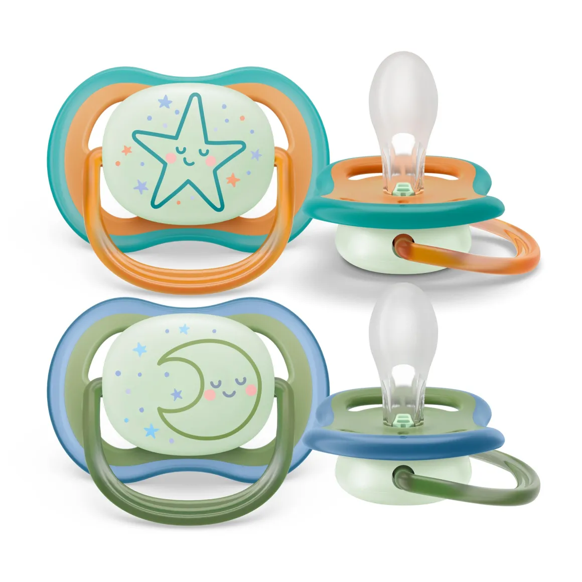 Pulsante fluorescente a lunga durata per trovare facilmente il ciuccio. Confezione da 2 succhietti con tettarella simmetrica ortodontica senza BPA.