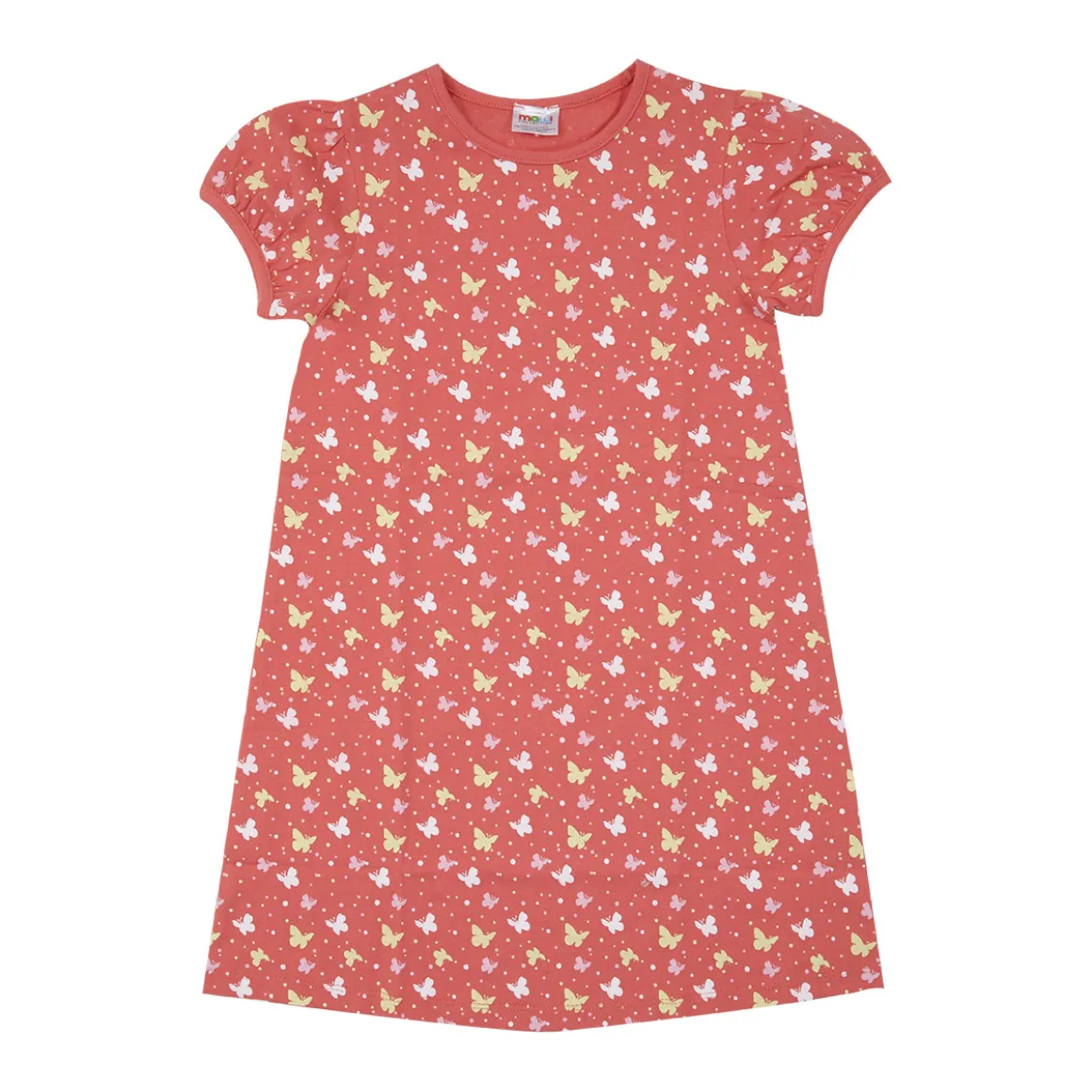 Tenero vestito estivo da bambina a mezza manica. Il capo si presenta in colorazione corallo con stampa allover farfalle bianche, rosa e gialle. Modelllo girocollo. La vestibilità è morbida. Accessori non in vendita. La confezione contiene solo il capo di abbigliamento