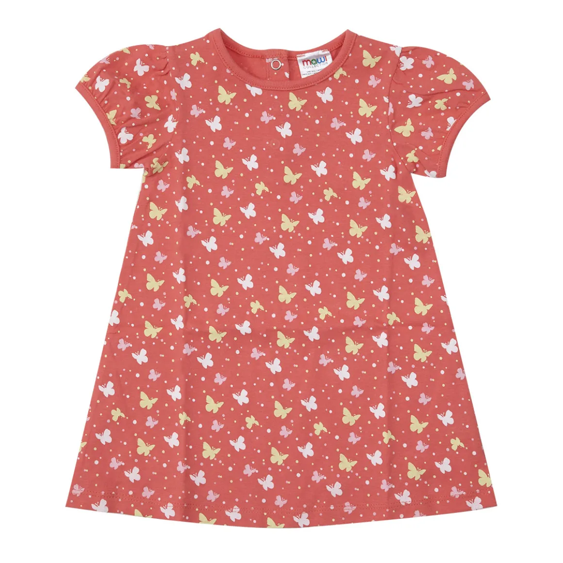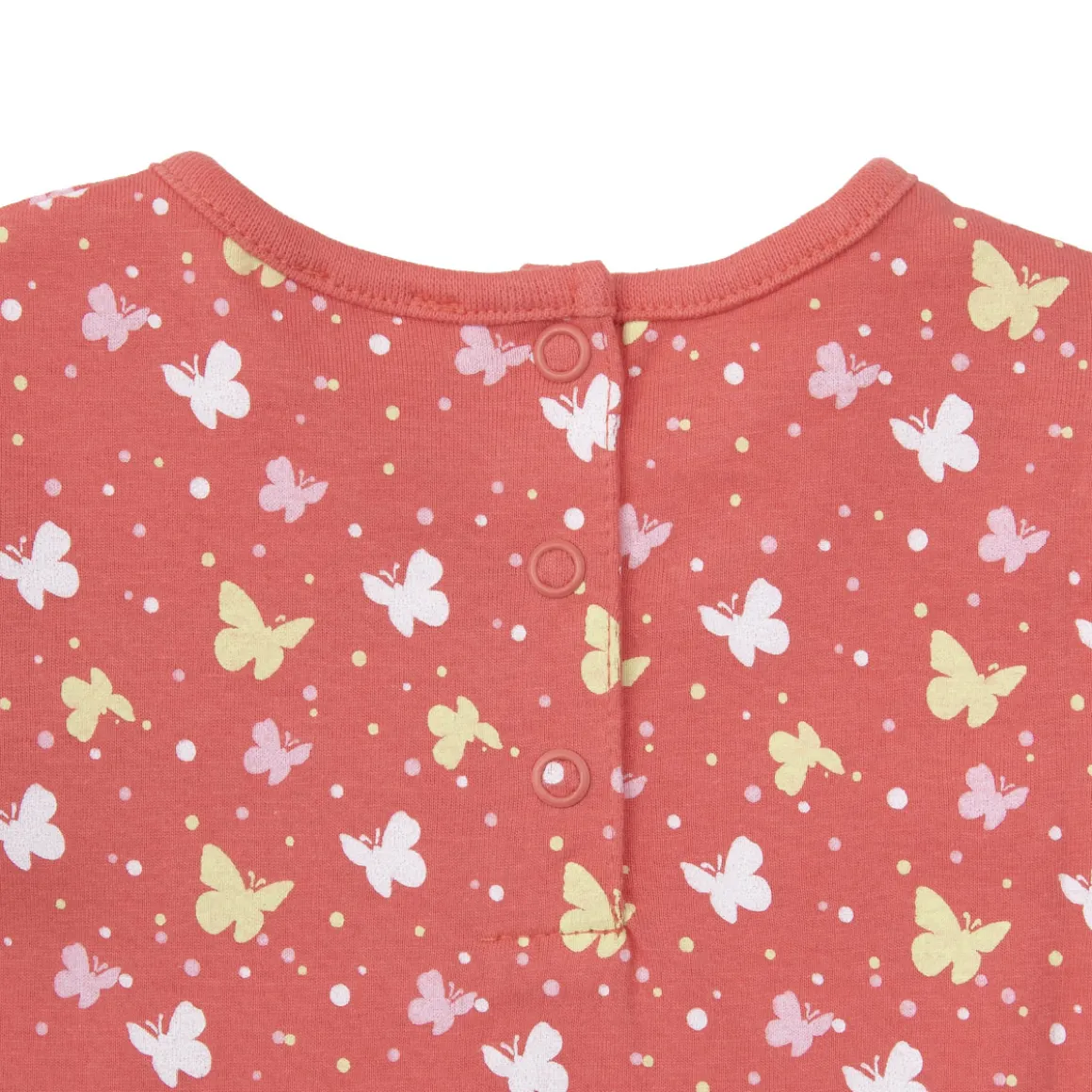Tenero vestito estivo da bambina a mezza manica. Il capo si presenta in colorazione corallo con stampa allover farfalle bianche, rosa e gialle. Modelllo girocollo. La vestibilità è morbida e pratica grazie ai bottoni a clip sulla schiena. Accessori non in vendita. La confezione contiene solo il capo di abbigliamento