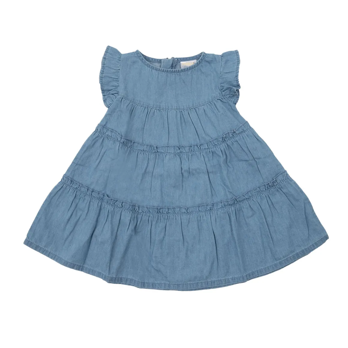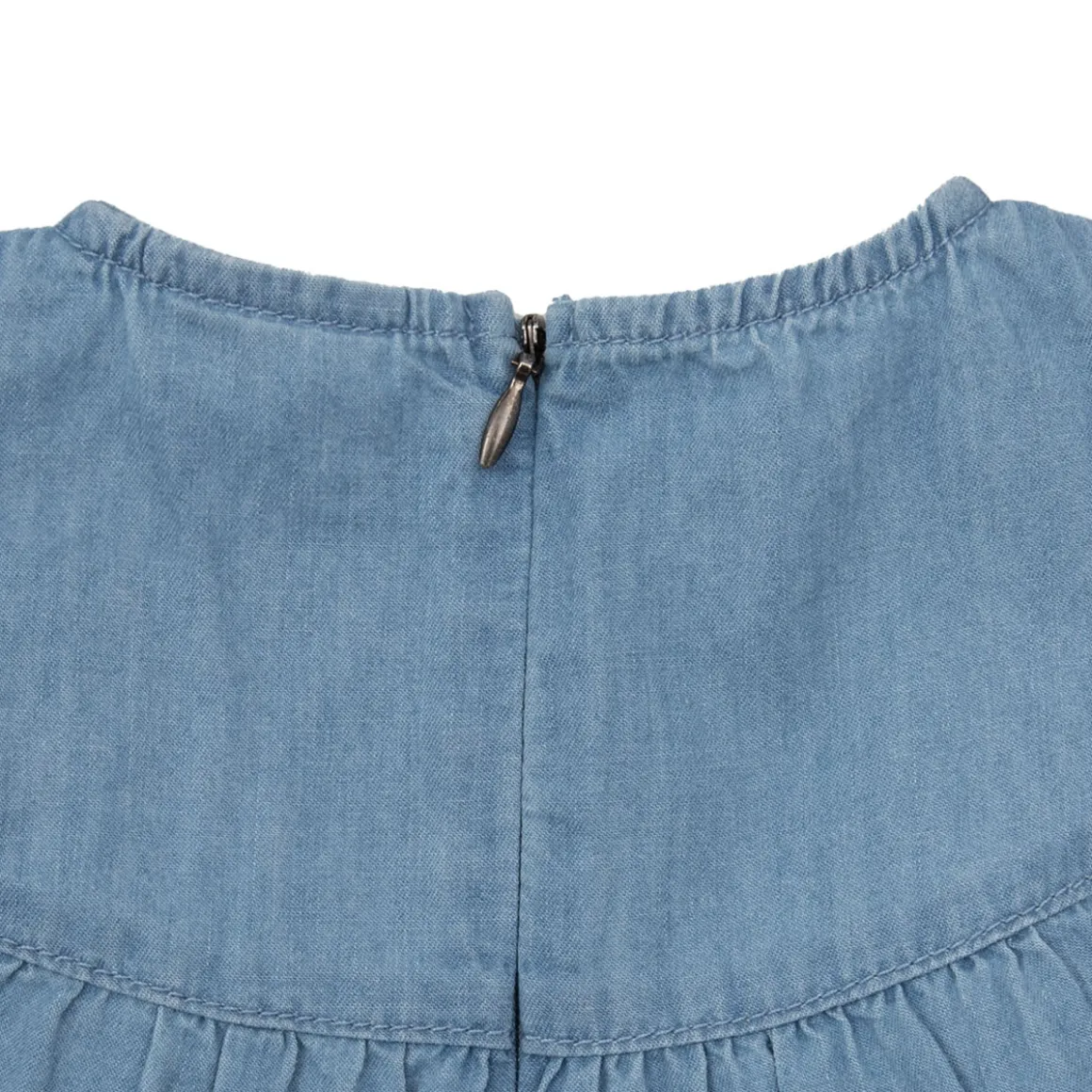 Tenero vestito estivo da bambina a giromanica. Il capo si presenta in colorazione blu denim; sotto la vita in un pezzo unico la gonna morbida a balze. Modelllo girocollo con frill lungo il giromanica. La vestibilità è morbida e pratica grazie alla presenza di cerniera sulla schiena. Accessori non in vendita. La confezione contiene solo il capo di abbigliamento