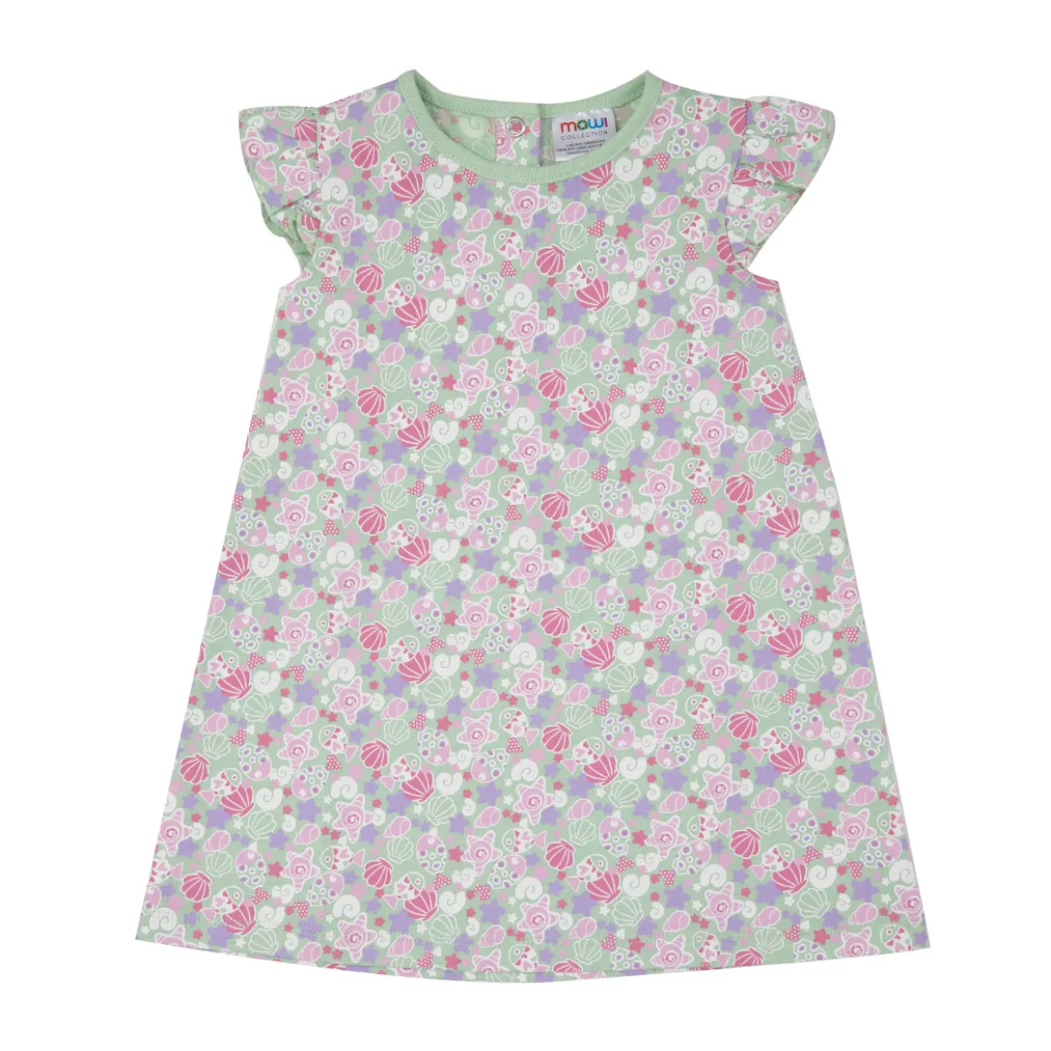 Tenero vestito estivo da bambina a giromanica. Il capo presenta su sfondo verde chiaro una stampa allover a tema marino nelle varianti del rosa e lilla; sotto la vita in un pezzo unico la gonna morbida semplice. Modelllo girocollo. La vestibilità è morbida e prarica grazie ai bottoni a clip sulla schiena. Il vestito semplice è adatto per diverse occasioni. Accessori non in vendita. La confezione contiene solo il capo di abbigliamento