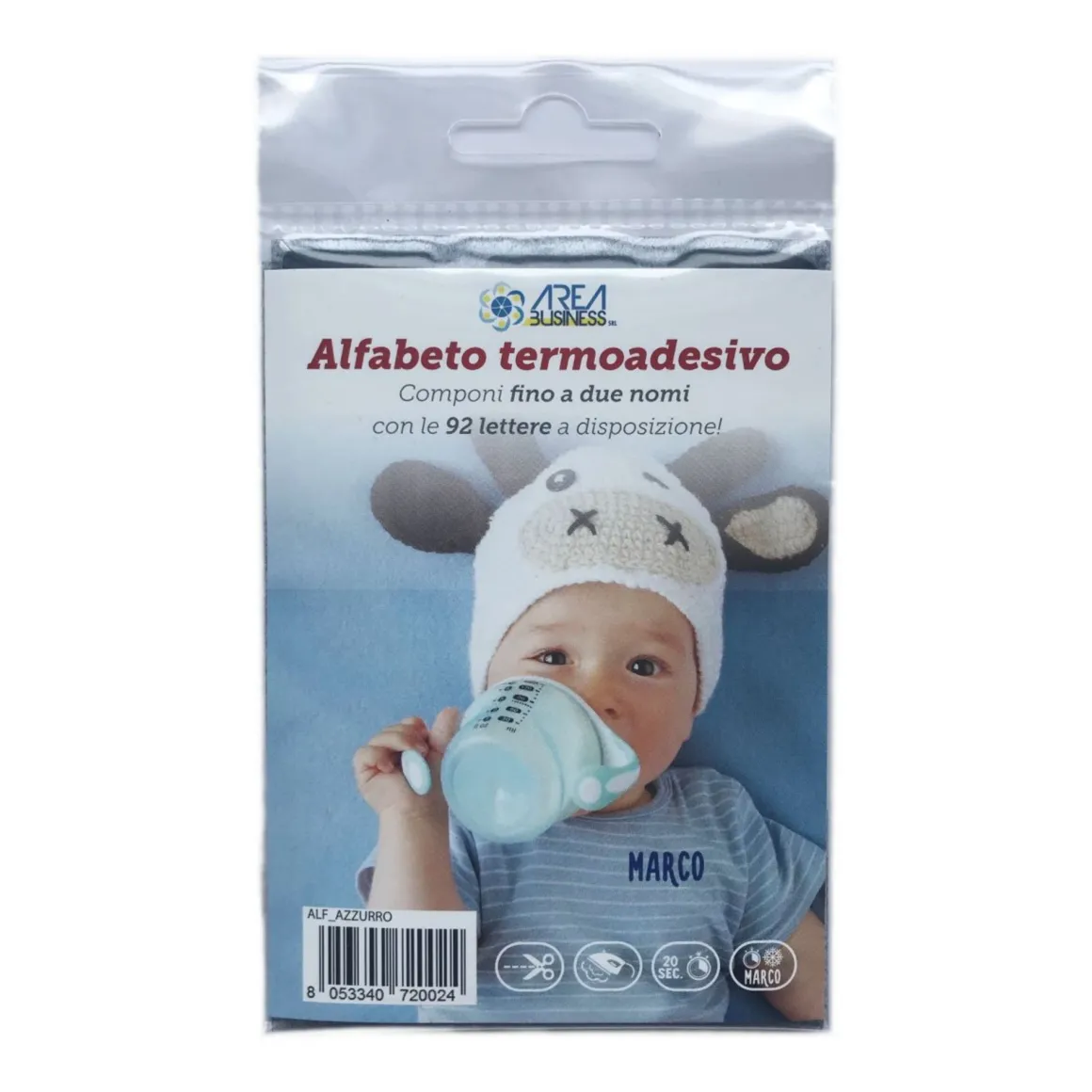 Alfabeto termoadesivo per contrassegnare con il nome del proprio bambino vestiti e biancheria. Si possono comporre fino a due nomi con le 92 lettere a disposizione nel kit. Si tagliano le lettere e con il ferro da stiro si fissano a vestiti o bancheria. Tempo necessaio per far aderire le lettere ai capi circa 20 secondi.
