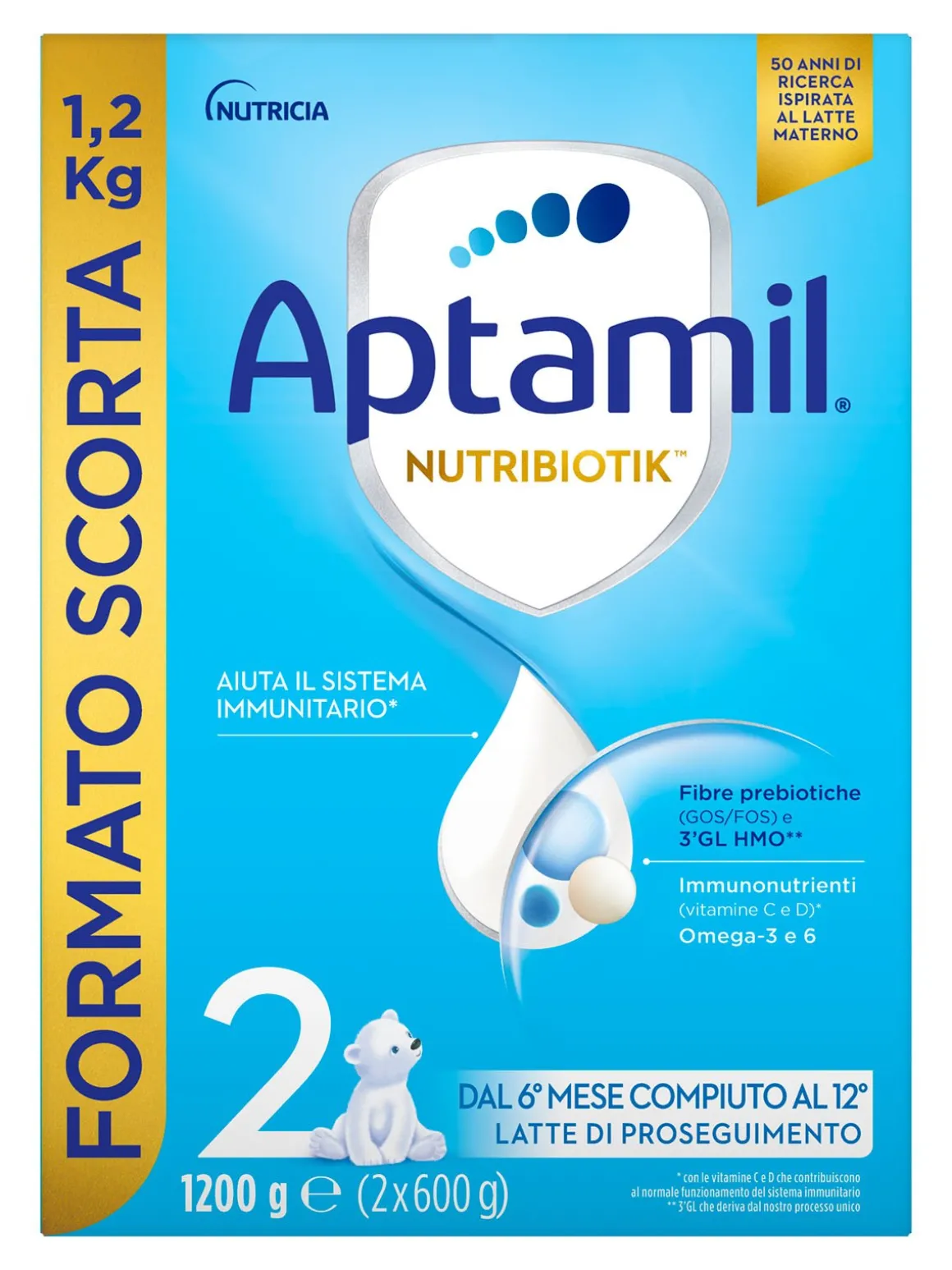 Avvertenze importanti: il latte materno è l’alimento ideale per il lattante ed è raccomandato come alimento esclusivo fino al 6° mese e come componente lattea di una dieta equilibrata durante lo svezzamento e anche dopo l’anno di vita. Se manca o è insufficiente si può utilizzare un latte di proseguimento solo su indicazione del Pediatra. Aptamil Nutribiotik 2 è idoneo per i lattanti solo dopo il compimento del 6° mese, non deve essere utilizzato come sostituto del latte materno nei primi 6 mesi di vita ed è da intendersi come parte di un’alimentazione diversificata. L’inizio dello svezzamento deve avvenire unicamente seguendo le indicazioni del Pediatra.