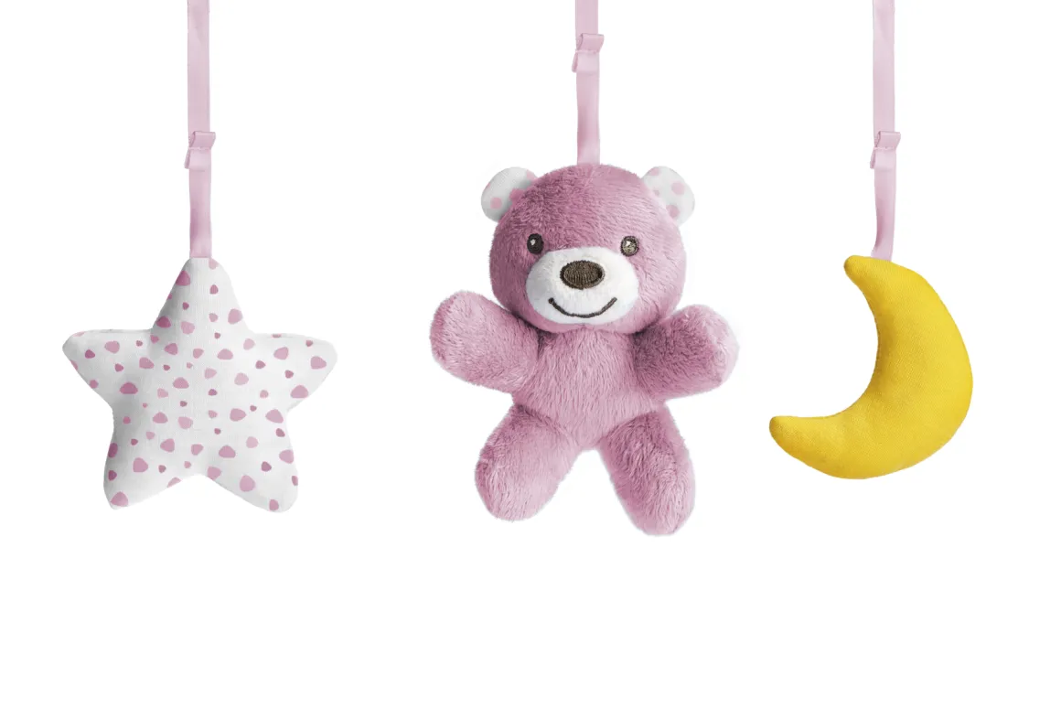 – 3 pendenti in tessuto a forma di orsetto, luna e stella.