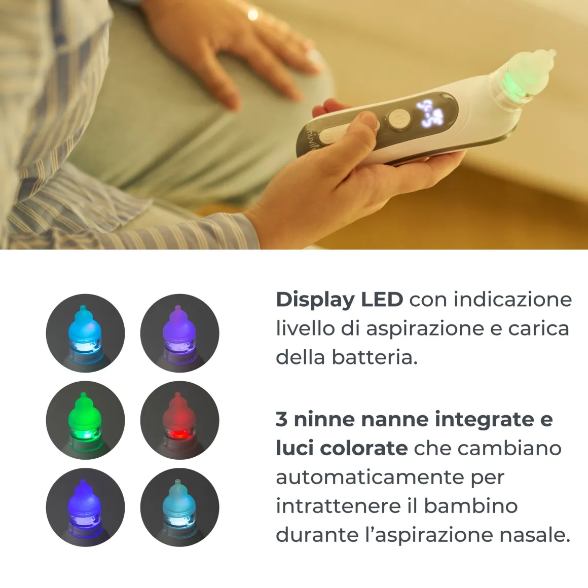 I 3 beccucci intercambiabili in dotazione in silicone morbido aderiscono al naso senza forzature e le diverse forme aiutano ad aspirare diversi tipi di muco (denso, superficiale o in profondità), assicurando un’esperienza confortevole e sicura.