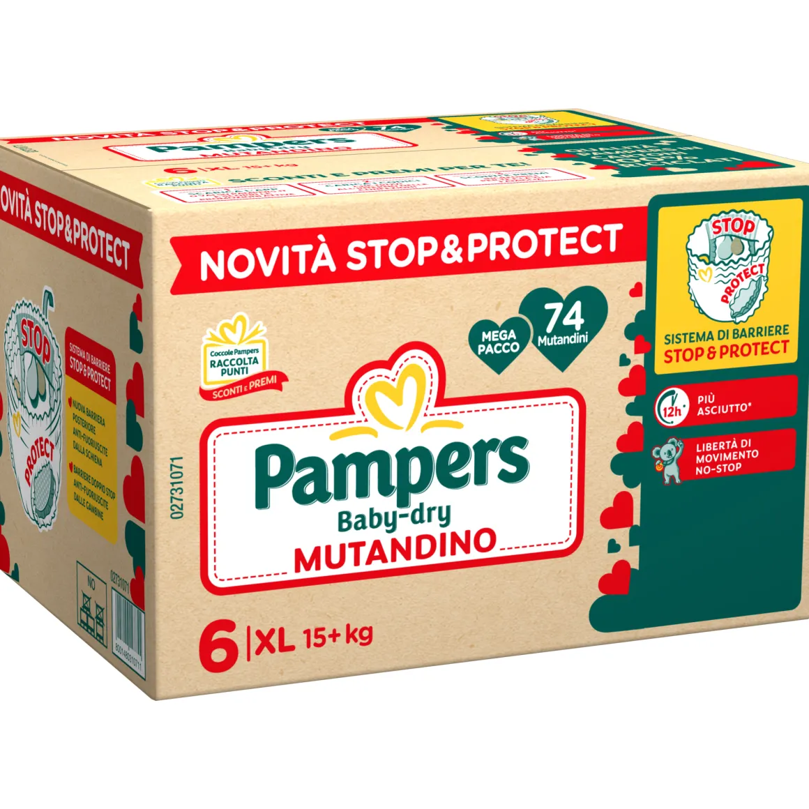 Pampers Baby Dry Mutandino è il nuovo pannolino a mutandina con una fascia elastica avvolgente a 360° che rende il cambio facile e veloce.