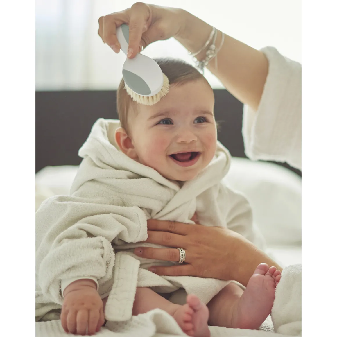 – Spazzola con folte setole in lana naturale; morbida e delicata sulla cute, perfetta per i primi capelli sottili dei bambini.