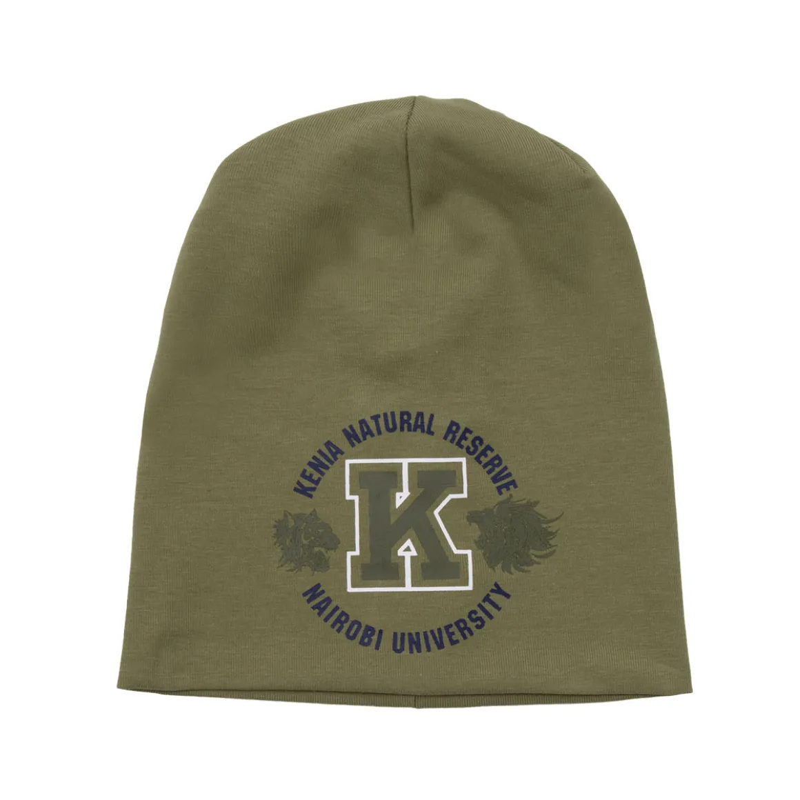Berretto da bambino. Il beretto si sviluppa in verde tinta unita ed è arricchito da una stampa frontale. Vestibilità pratica e confortevole.