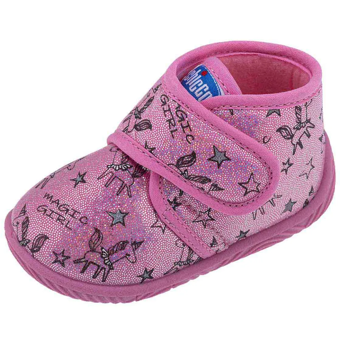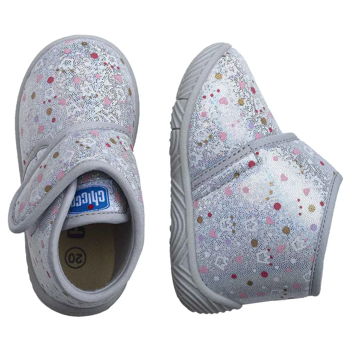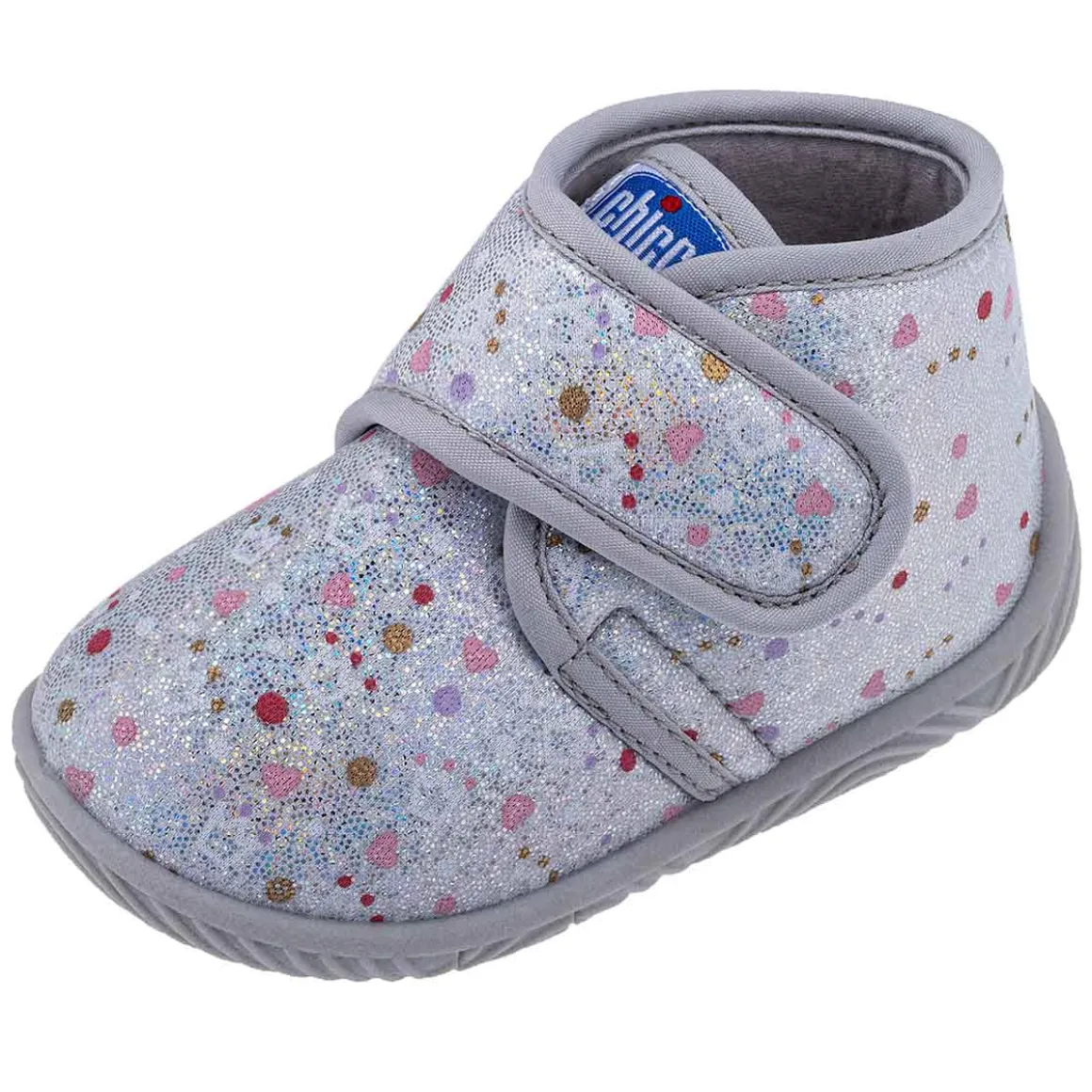 Pantofola argento con effetto glitter e all over di micro pois colorati.