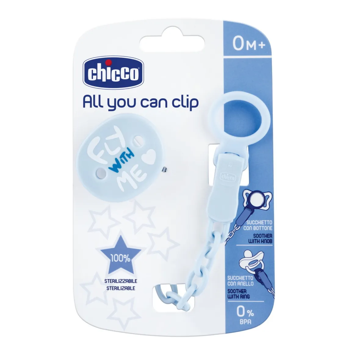 La Clip universale Chicco azzurra è l’ideale per i genitori di neonati e bambini. È progettata per potersi ancorare in modo sicuro e pratico a tutti i succhietti Chicco, sia quelli con bottone che quelli con anello e permette un facile passaggio da una tipologia all’altra.