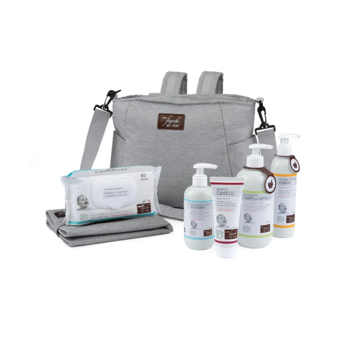 Il Kit borsa fasciatoio è specifico per la detersione delicata fin dalla nascita. Una capiente e funzionale borsa contiene al suo interno tutto il necessario per il cambio pannolino anche fuori casa: