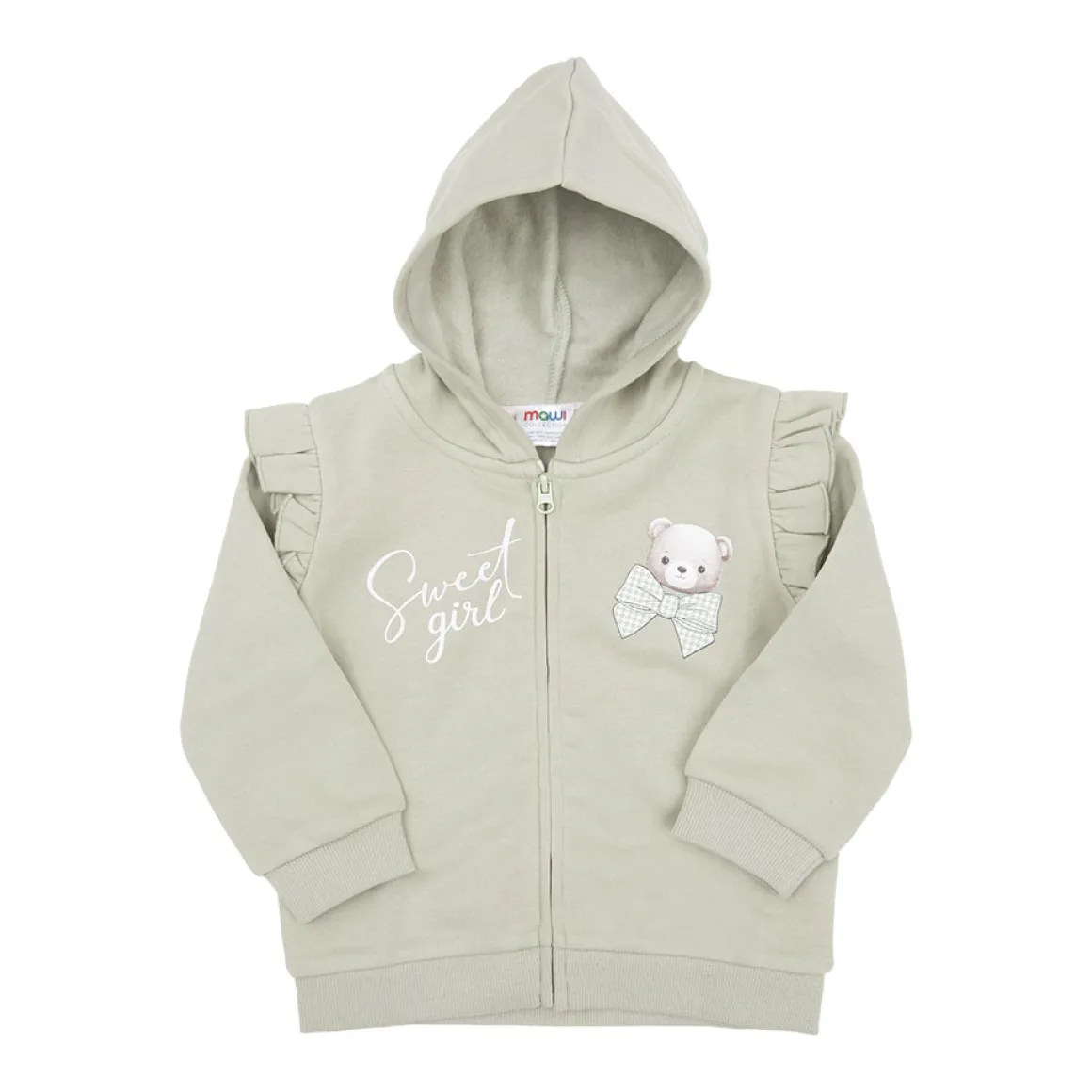 Casual felpa con zip da bambina. Il capo si sviluppa in total verde con stampa tenera sul davanti. La vestibilità è morbida e pratica grazie alla zip intera. Modello con cappuccio e frill sulle spalline. La felpa da bambina è adatta a occasioni casual. Accessori non in vendita. La confezione contiene solo il capo d’abbigliamento