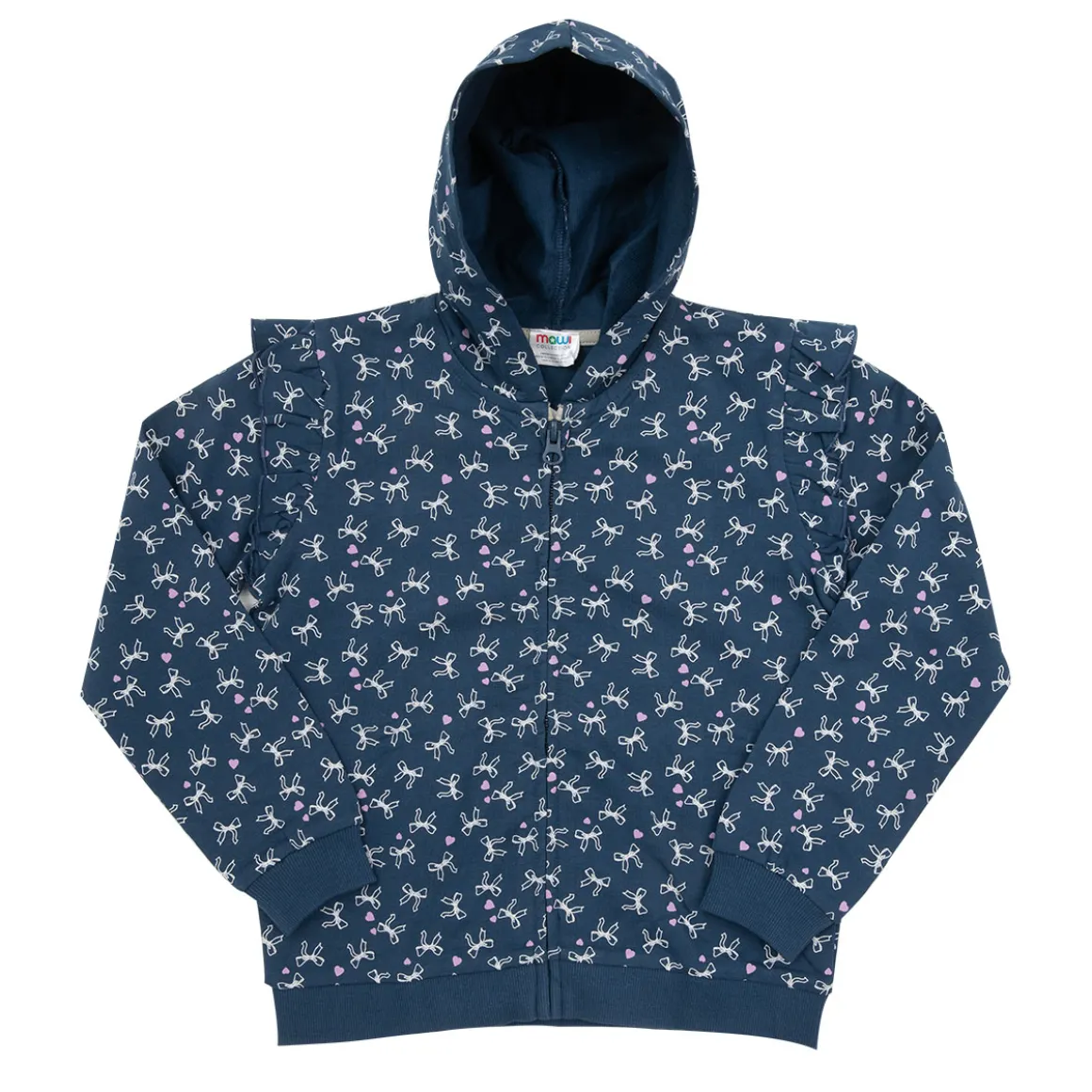 Casual felpa con zip e cappuccio da bambina. Il capo si sviluppa in total blu scuro e stampa allover “fiocchetti”. Modello con rouches sulle spalle. La vestibilità è morbida e pratica grazie alla zip intera sul davanti. La felpa da bambina è adatta a occasioni casual. Accessori non in vendita. La confezione contiene solo il capo d’abbigliamento