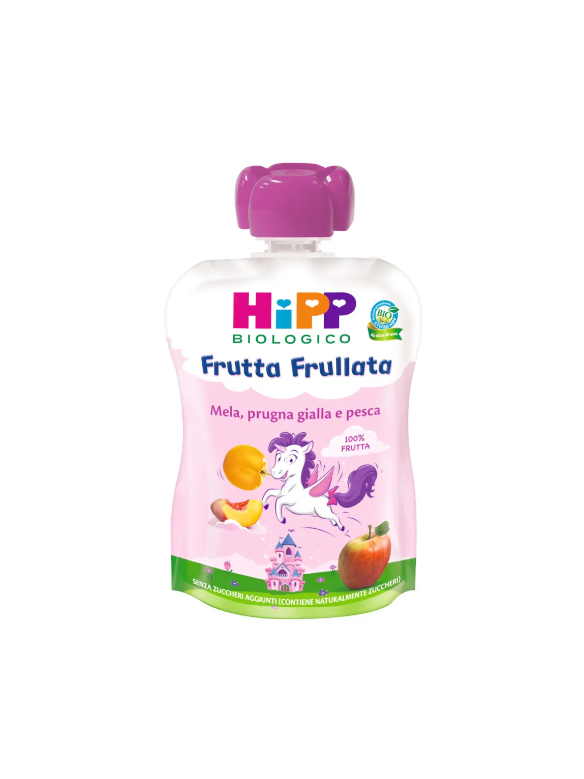 Descrizione prodotto: “Frutta frullata Unicorno mela prugna gialla e pesca è ideale per una merenda o un fine pasto gustoso e genuino ed è perfetta anche per il consumo fuori casa. Indicata a partire dal 6° mese d’età.