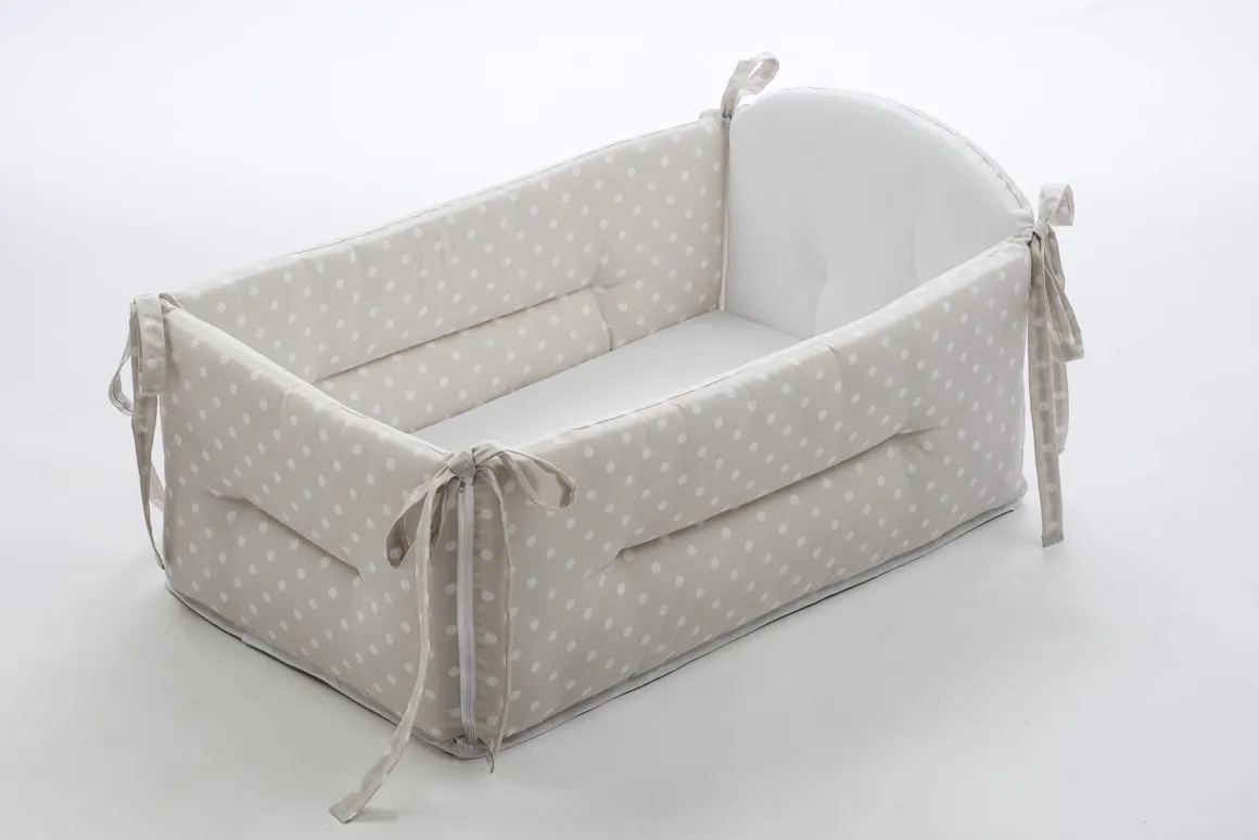 Riduttore per lettino comodo e versatile, completo di base imbottita. Realizzato con 4 cerniere sugli angoli che ne consentono una facile apertura totale. Parte in testata più alta e sagomata. Tessuto 100% cotone di colore panna.