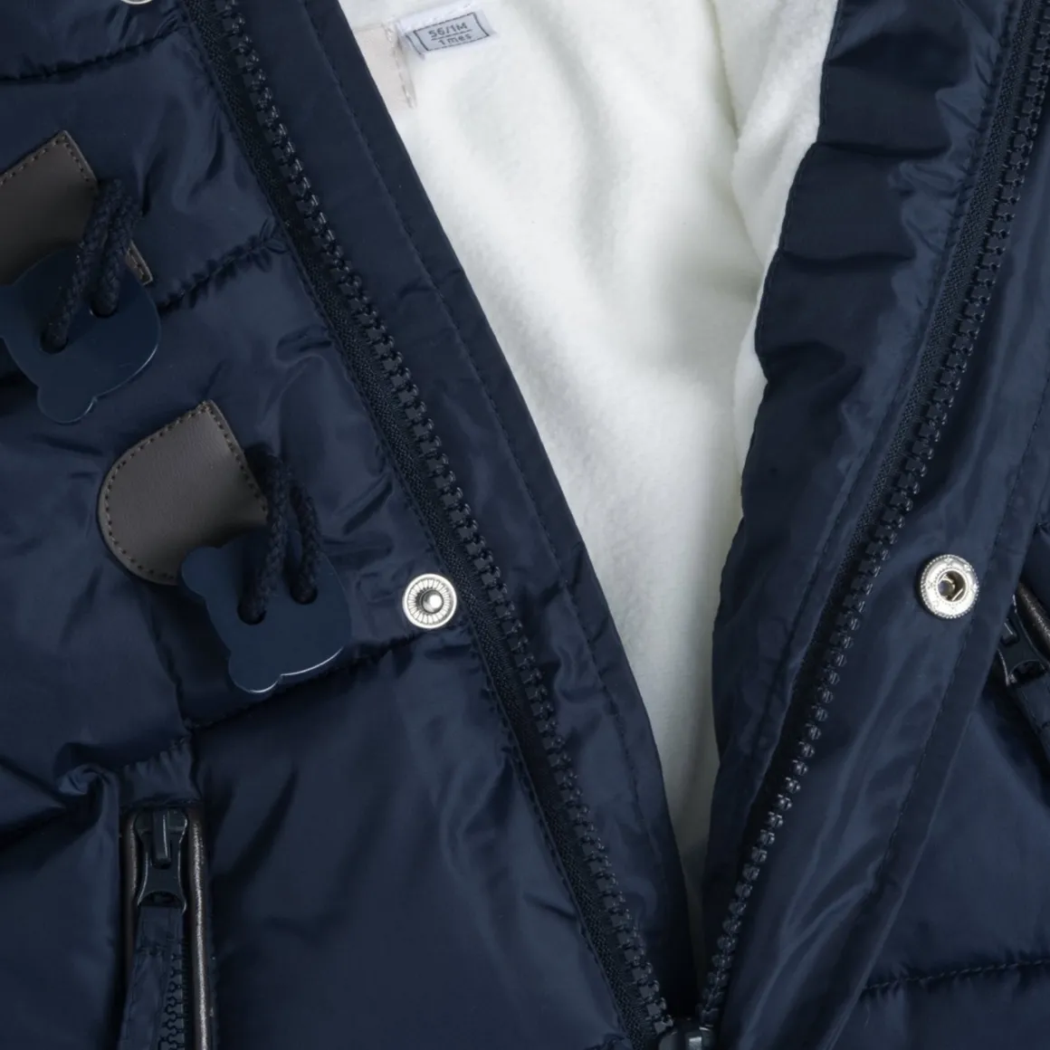 - Chiusura frontale con zip nascosta e alamari a forma di orso, polsi in costina elasticizzata