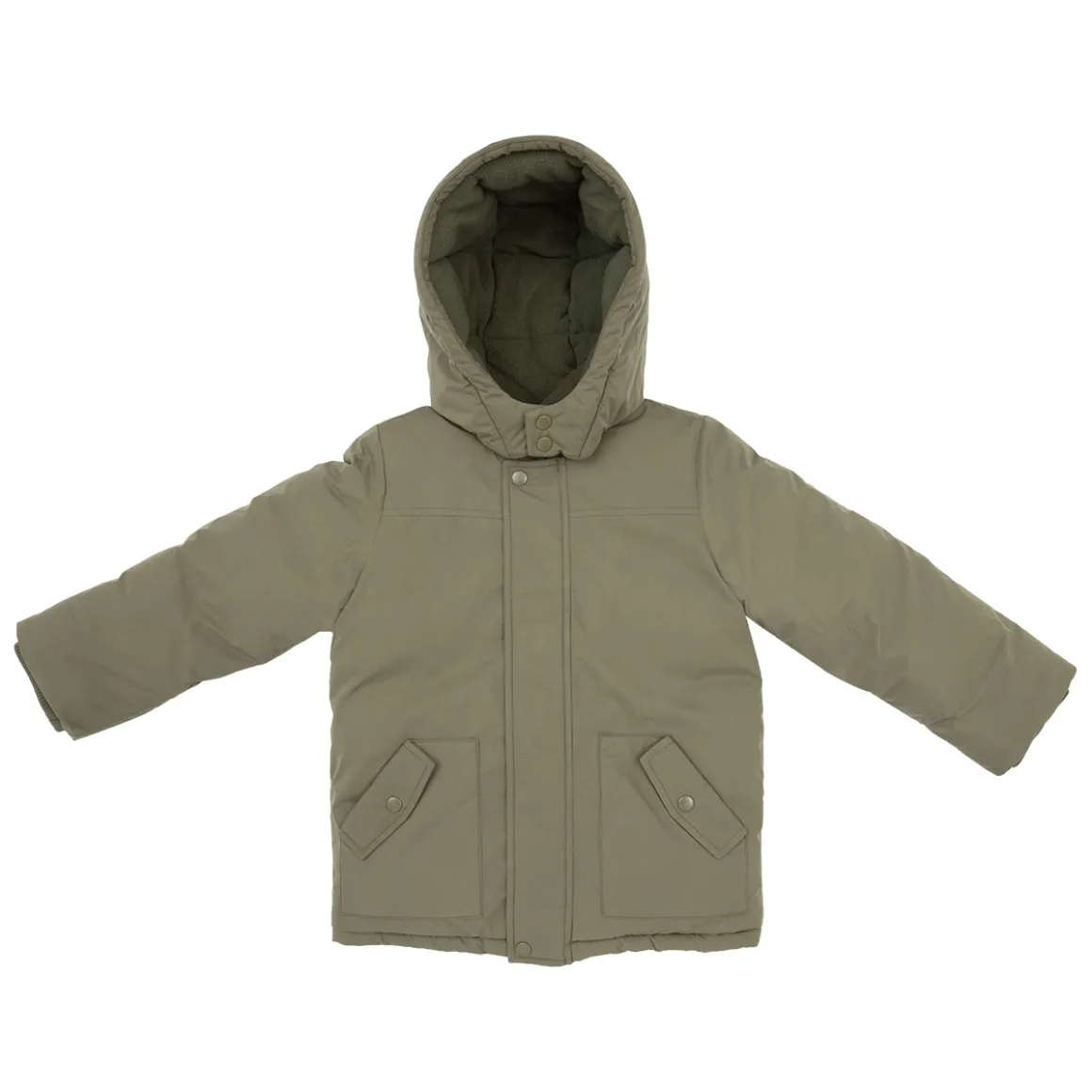 Giubbino imbottito modello parka da bambino. Il capo si sviluppa in total verde militare. Modello con cappuccio, tasconi e doppia chiusura. La vestibilità è morbida. Accessori non in vendita. La confezione contiene solo il capo d’abbigliamento