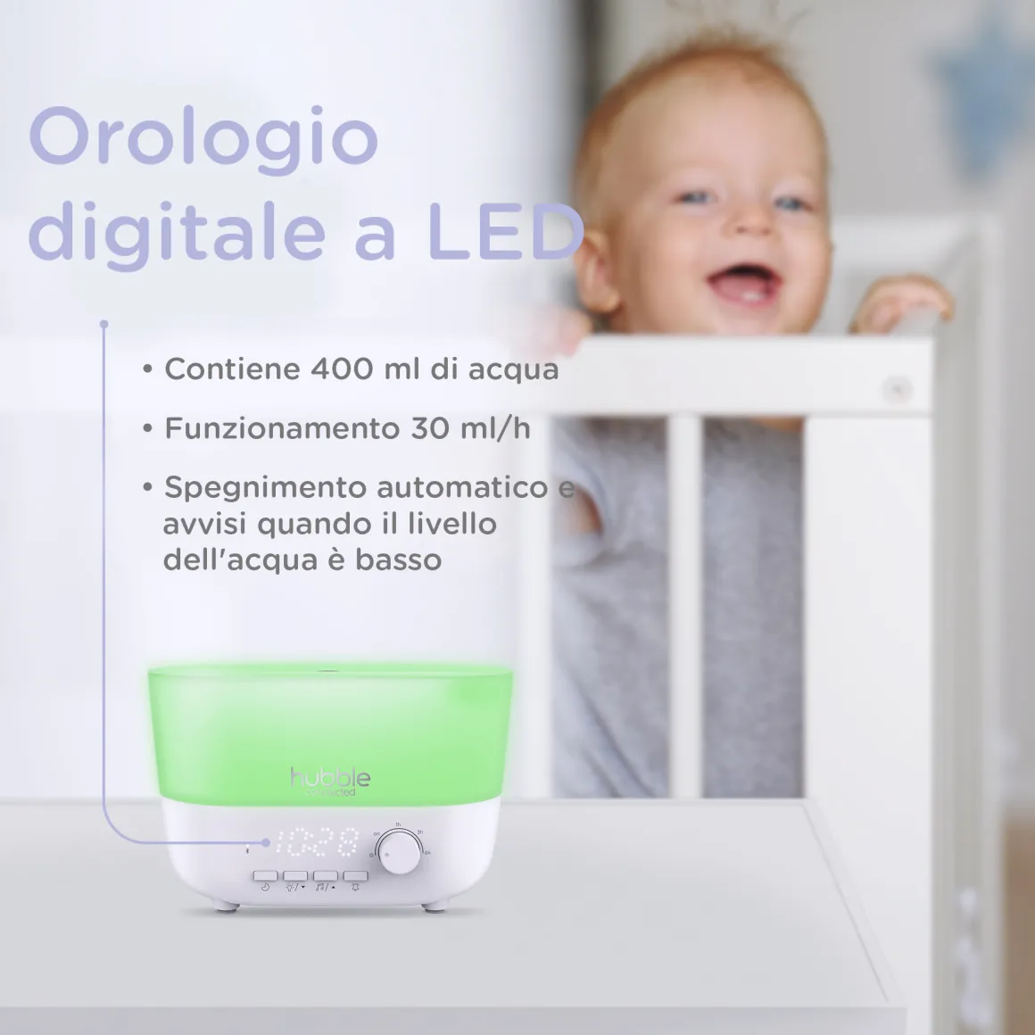 Umidificatore con diffusore di aromi per creare un’ambiente rilassante nella nursery del bambino. Tanica per l’acqua con capacità di 400ml, nebulizzazione fino a 30ml/ora. Sistema di spegnimento automatico e allarme quando il livello dell’acqua è troppo basso. Luci notturne in 7 colori soffusi, display digitale LED con orologio, Bluetooth Speaker per riprodurre musiche, autio libri per bambini e ninne nanne.