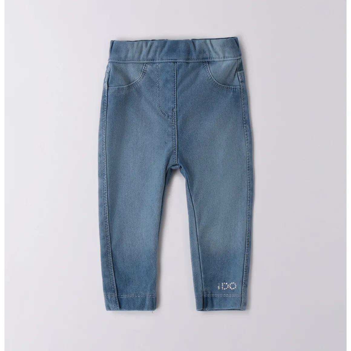 Leggings jeans bambina iDO da 9 mesi a 8 anni realizzati in denim stretch. Il modello ha vita elasticizzata, finte tasche laterali e logo iDO in applicazione sul fondo gamba.