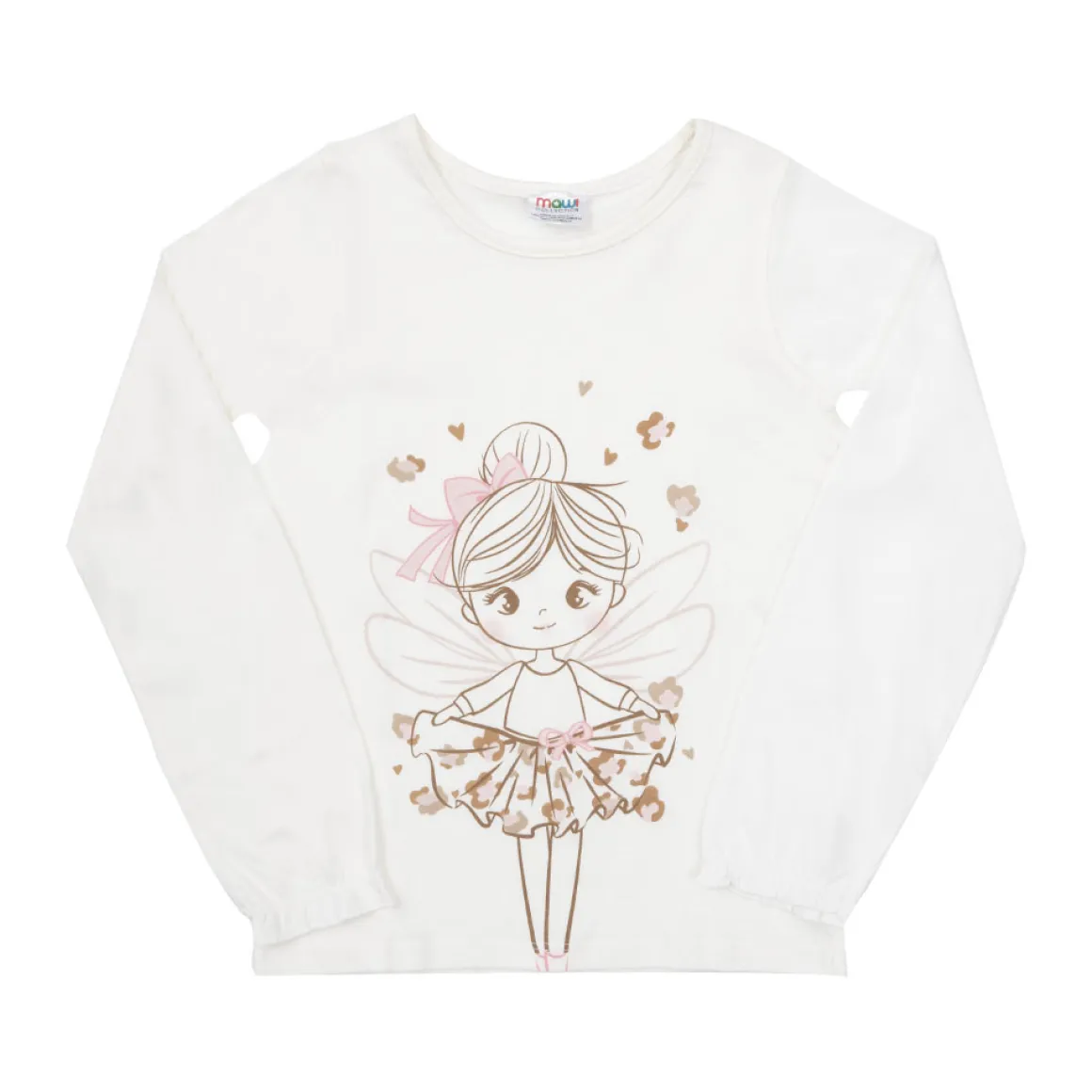 Maglia jersey a maniche lunghe da bambina. Il capo si presenta in tinta unita bianco panna con stampa “fatina” sul davanti. La vestibiilità è morbida e pratica. Modello girocollo con polsini arricciati. Accessori non in vendita. La confezione contiene solo il capo d’abbigliamento