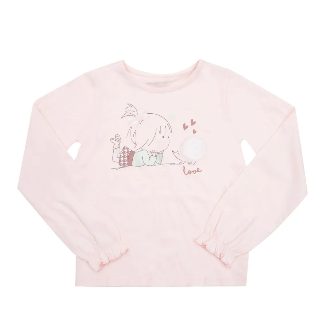Maglia jersey a maniche lunghe da bambina. Il capo si presenta in tinta unita rosa chiaro con stampa “tenera bimba” sul davanti. La vestibiilità è morbida. Modello girocollo con polsini arricciati. Accessori non in vendita. La confezione contiene solo il capo d’abbigliamento