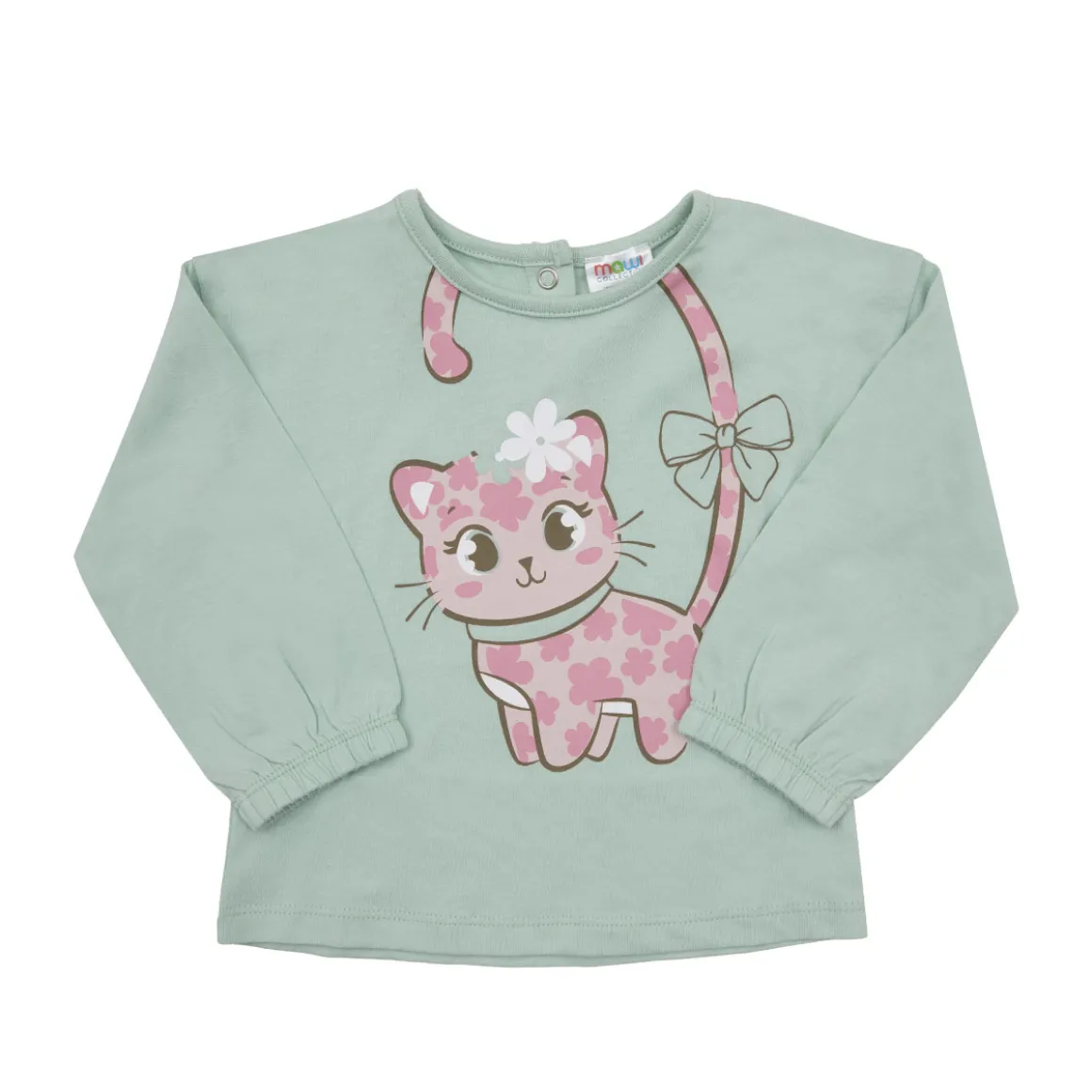 Casual maglia manica lunga da bambina. Il capo si presenta in total verde chiaro con stampa simpatica gattino rosa sul davanti. Modello girocollo. Vestibilità pratica e confortevole grazie ai bottoni a clip sul rerto e agli elastici sui polsi. Accessori non in vendita. La confezione contiene solo il capo d’abbigliamento