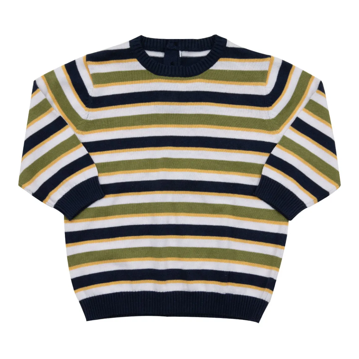 Maglia di cotone a maniche lunghe da bambino. Il capo si presenta con righe orizzontali blu, bianche, gialle e verdi. La vestibiilità è morbida e pratica grazie agli elastici sui polsi e in vita. Modello girocollo. Accessori non in vendita. La confezione contiene solo il capo d’abbigliamento