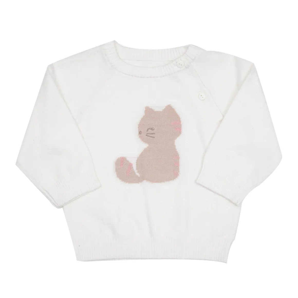 Maglia tricot raglan da bambina. Il capo si presenta in colorazione panna con intarso “gattino” di color marrone. Modello con apertura a due bottoni ad altezza girocollo. Il capo offre una vestibilità morbida e pratica. Accessori non in vendita. La confezione contiene solo il capo d’abbigliamento.