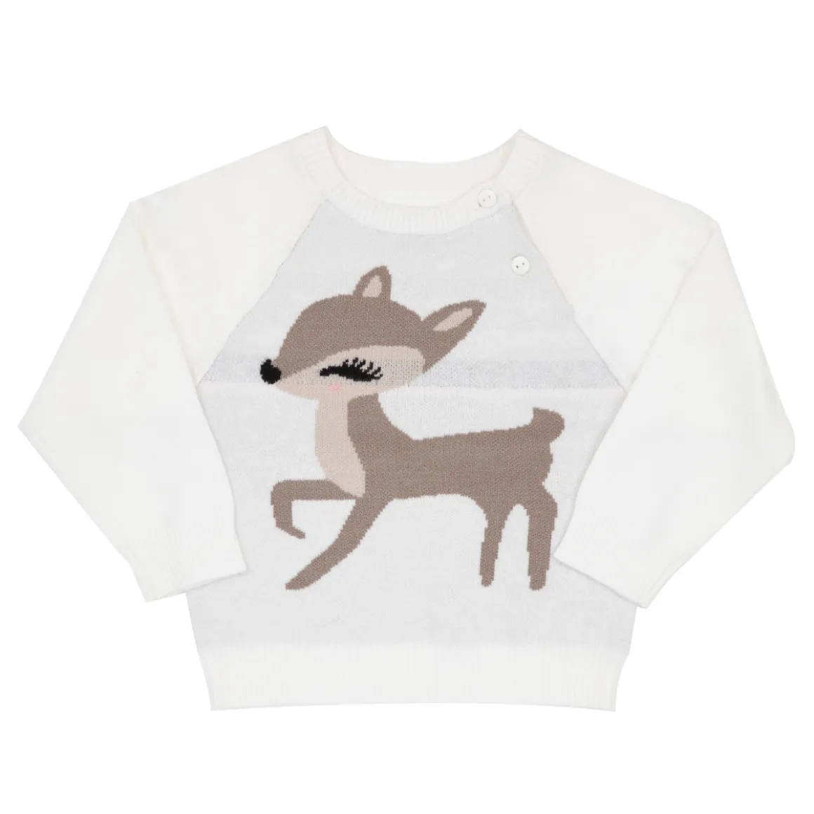 Maglia tricot raglan da bambina. Il capo si presenta in color panna con intarso “Cerbiatto”. Modello girocollo con apertura a due bottoni. Il capo offre una vestibilità morbida e pratica. Accessori non in vendita. La confezione contiene solo il capo d’abbigliamento.