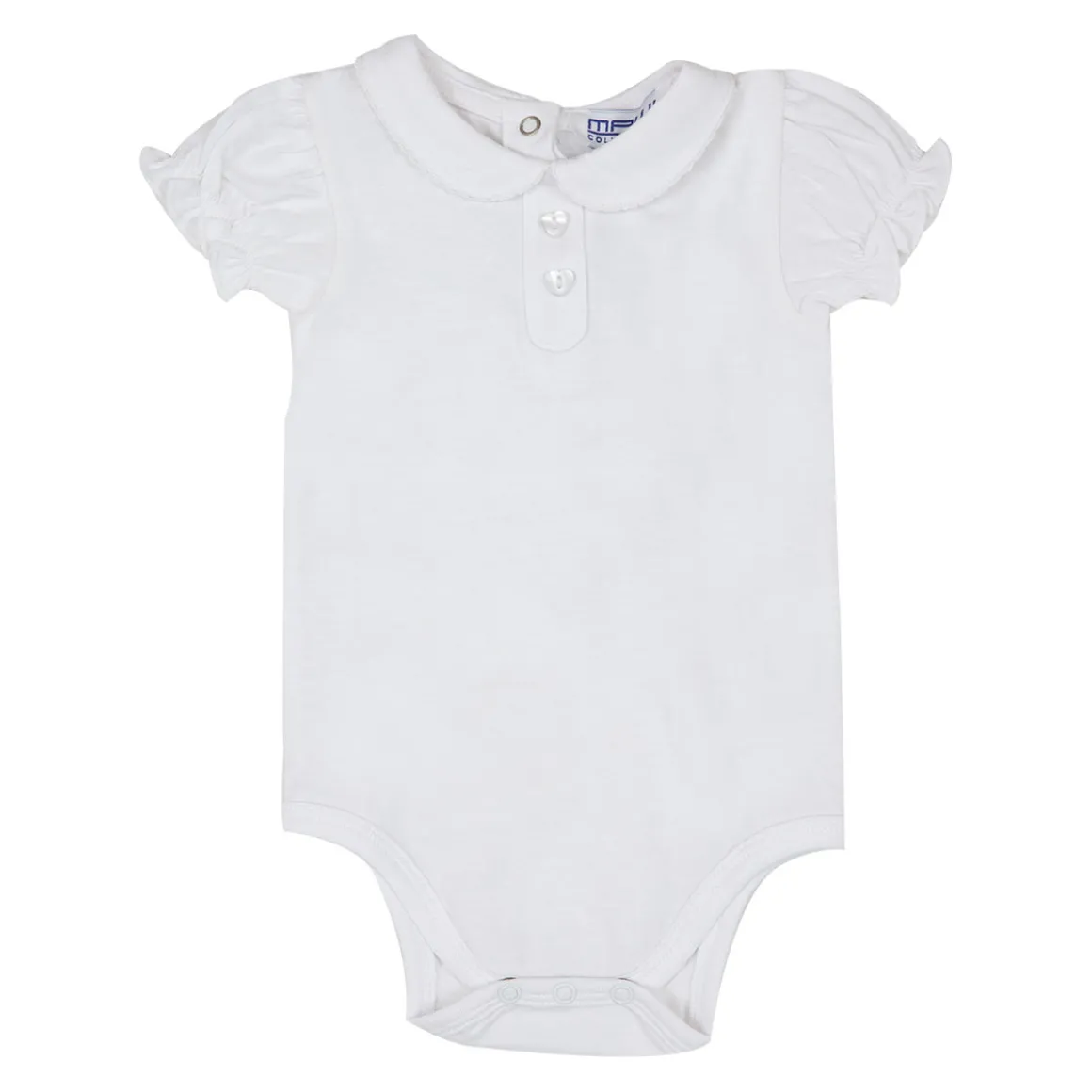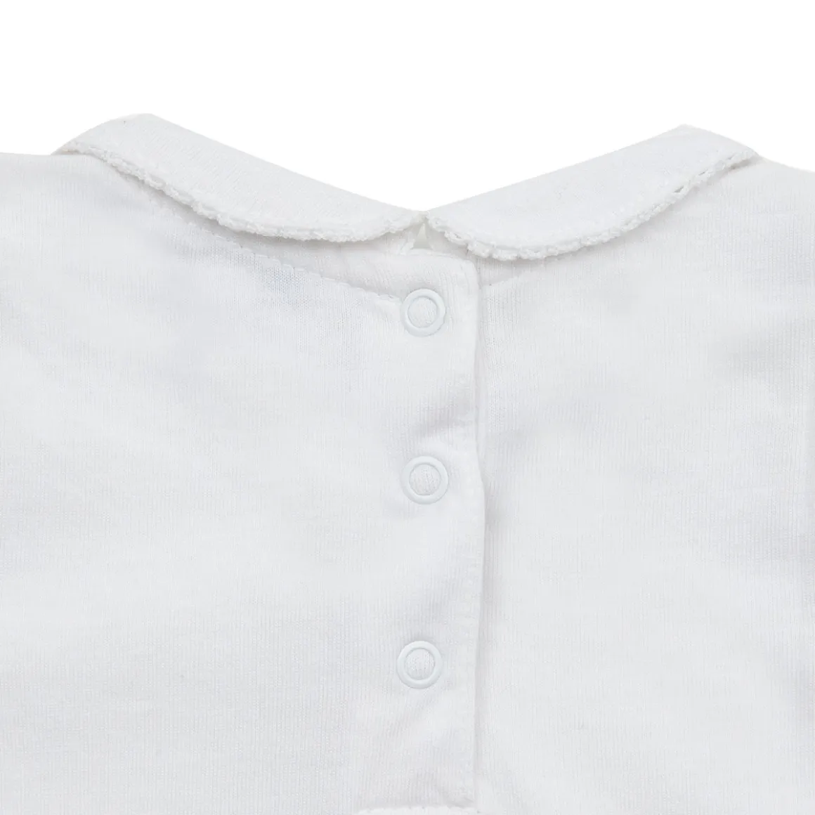 Body jersey tinta unita bianco ottico manica corta con colletto bordo ricamato. Il modello presenta una comoda apertura entrogamba con bottoncini a pressione per facilitare il cambio pannolino. Vestibilità comoda. Un modello super classico indispensabile per il guardaroba del tuo bimbo.