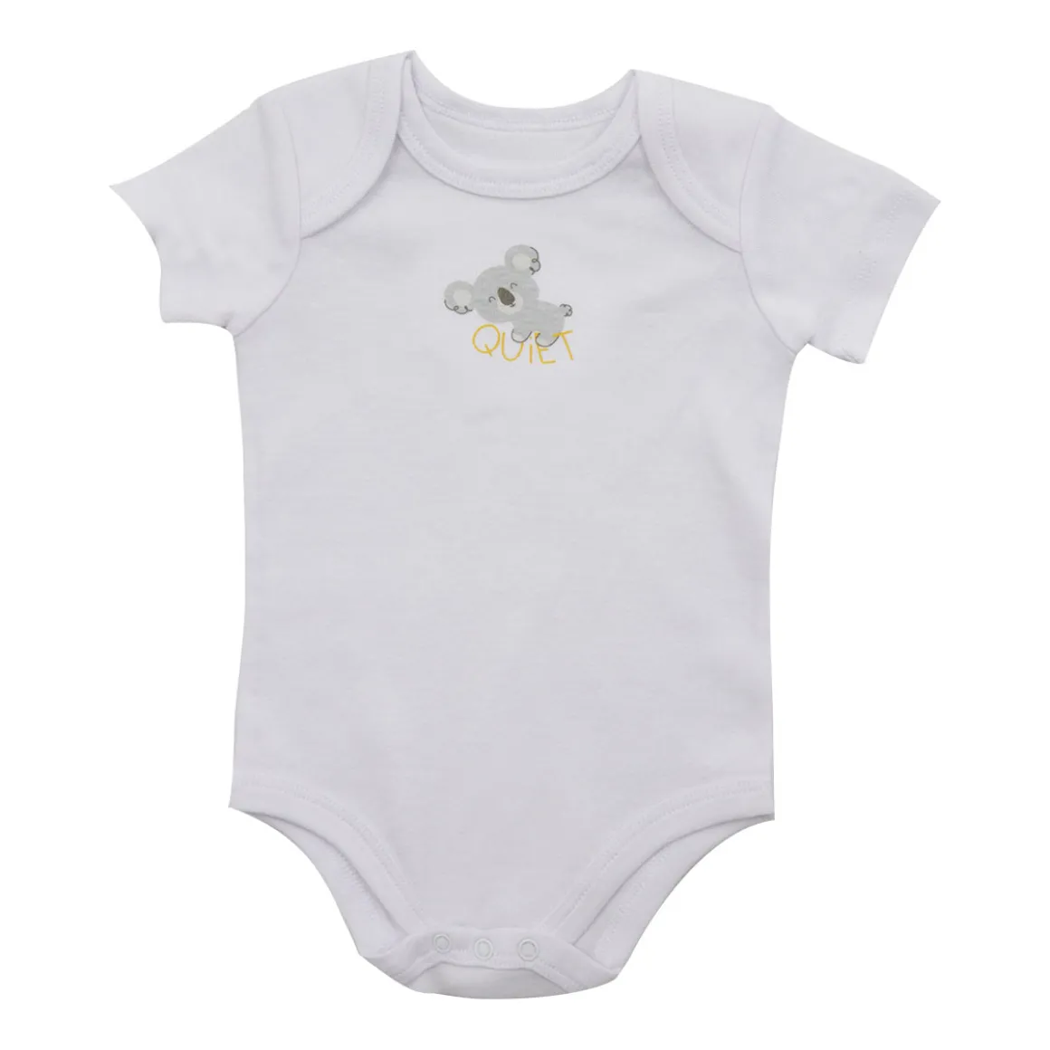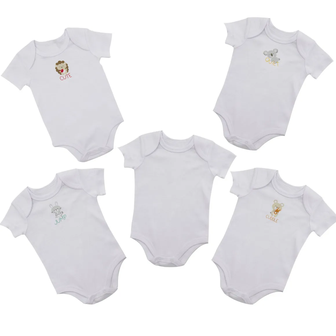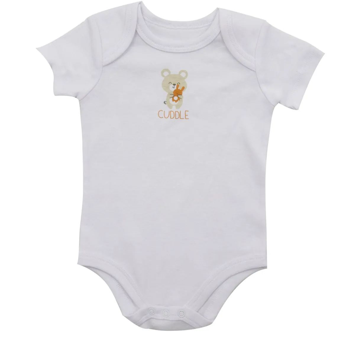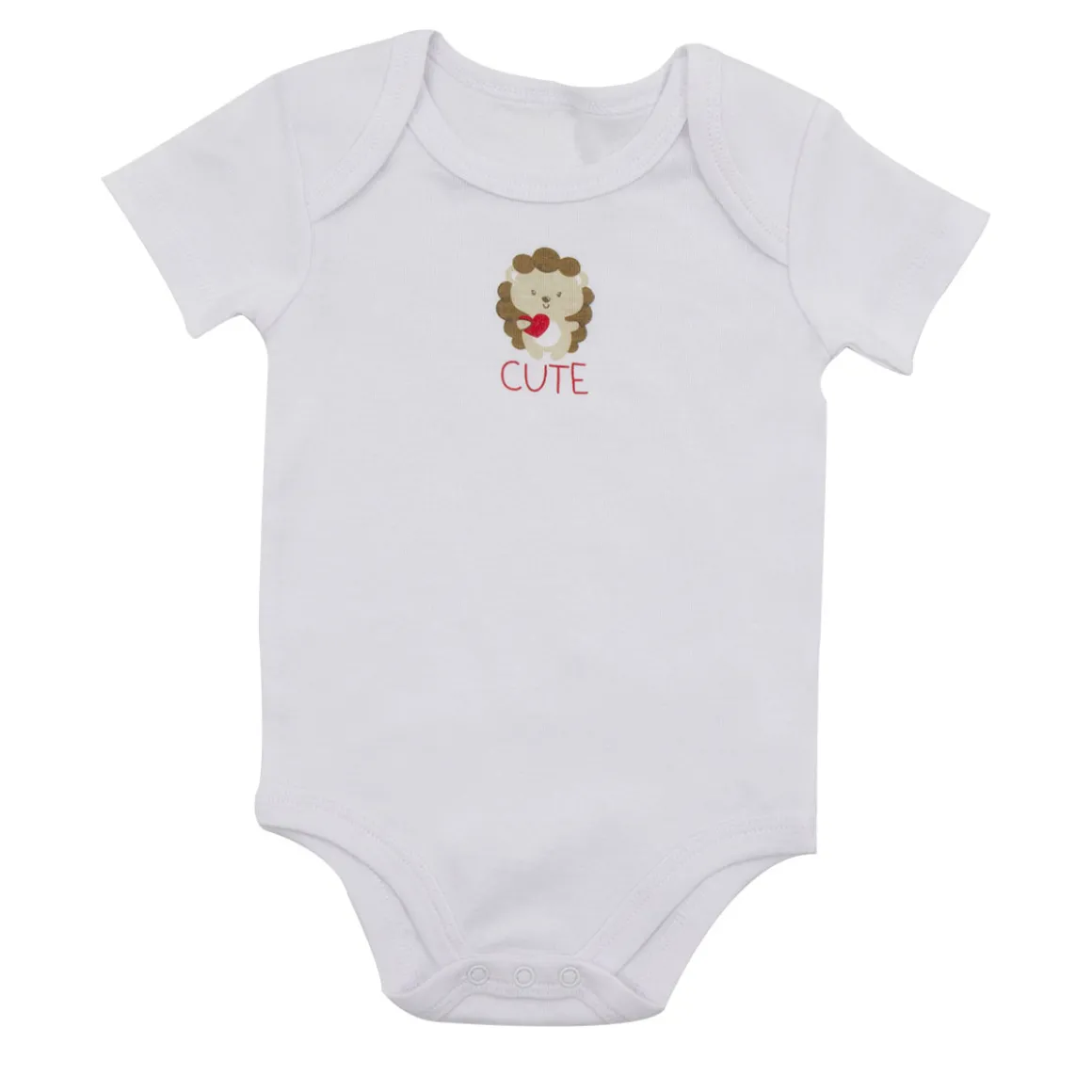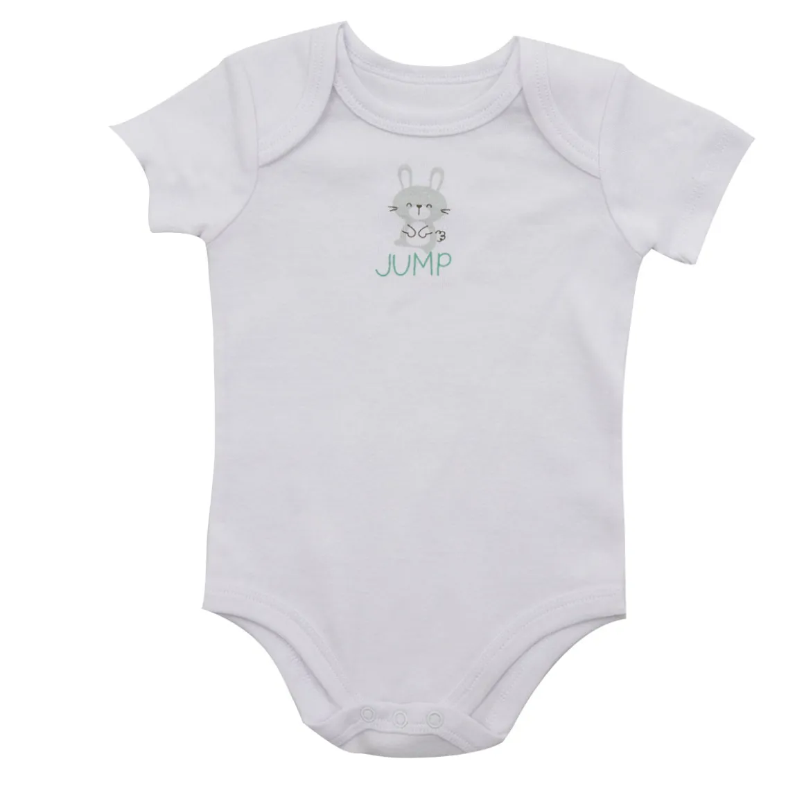 Set di 5 body manica corta scollo all ‘americana in costina a fondo bianco. Ogni body ha stampato un divertente animaletto. L’apertura con bottoni a pressione sul cavallo facilitano il cambio del pannolino e la vestizione.