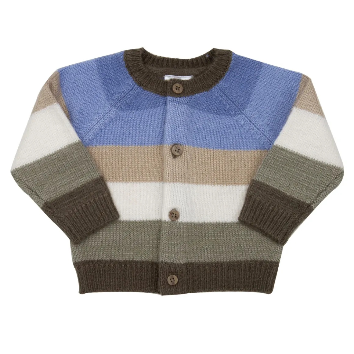 Cardigan tricot rigato . Il modello presenta dettaglio bottoni effetto legno e un disegno a rigoni multicolor . Perfetto per tutti i giorni ma anche per le occasioni più eleganti. Abbinabile con top e pantaloni dello stesso tema.