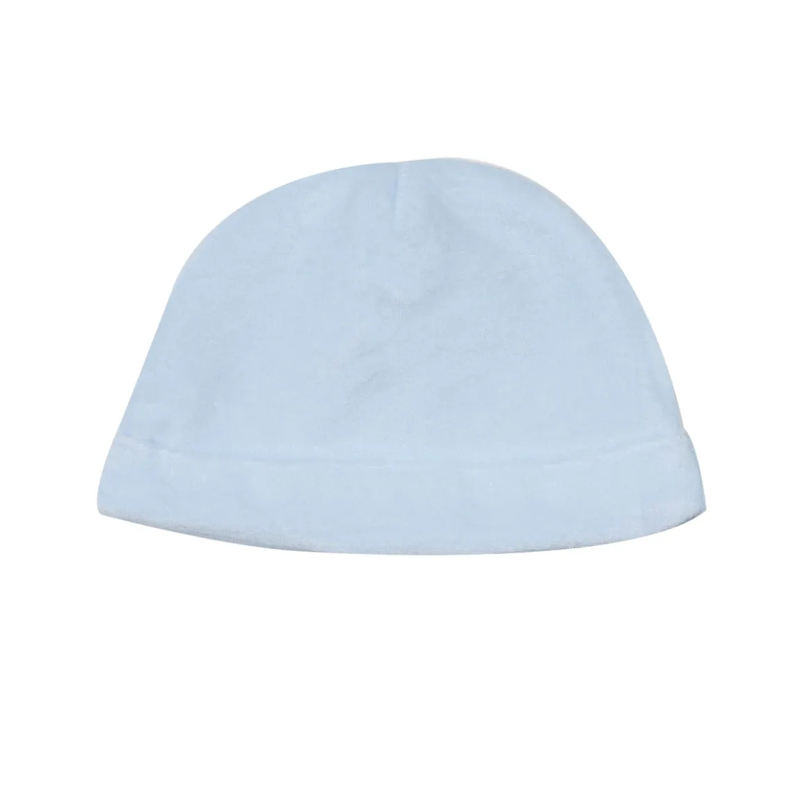 Cappellino a cuffia in ciniglia color azzurro con risvolto stampa orsetto. Grazie al tessuto morbido, caldo e confortevole garantisce il massimo confort, indispensabile per il corredino del tuo bambino. Disponibile in vari colori.
