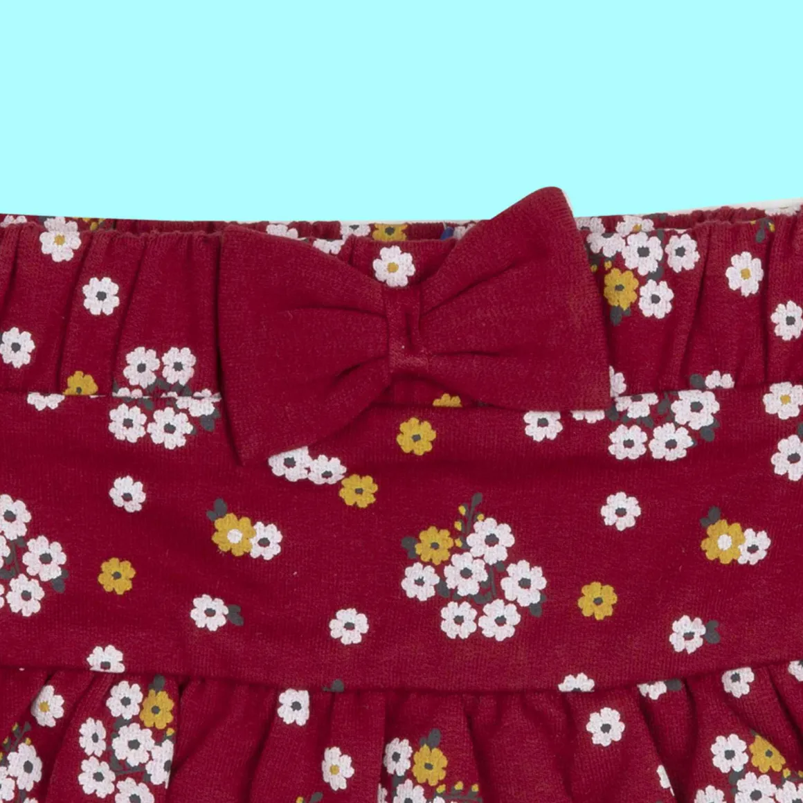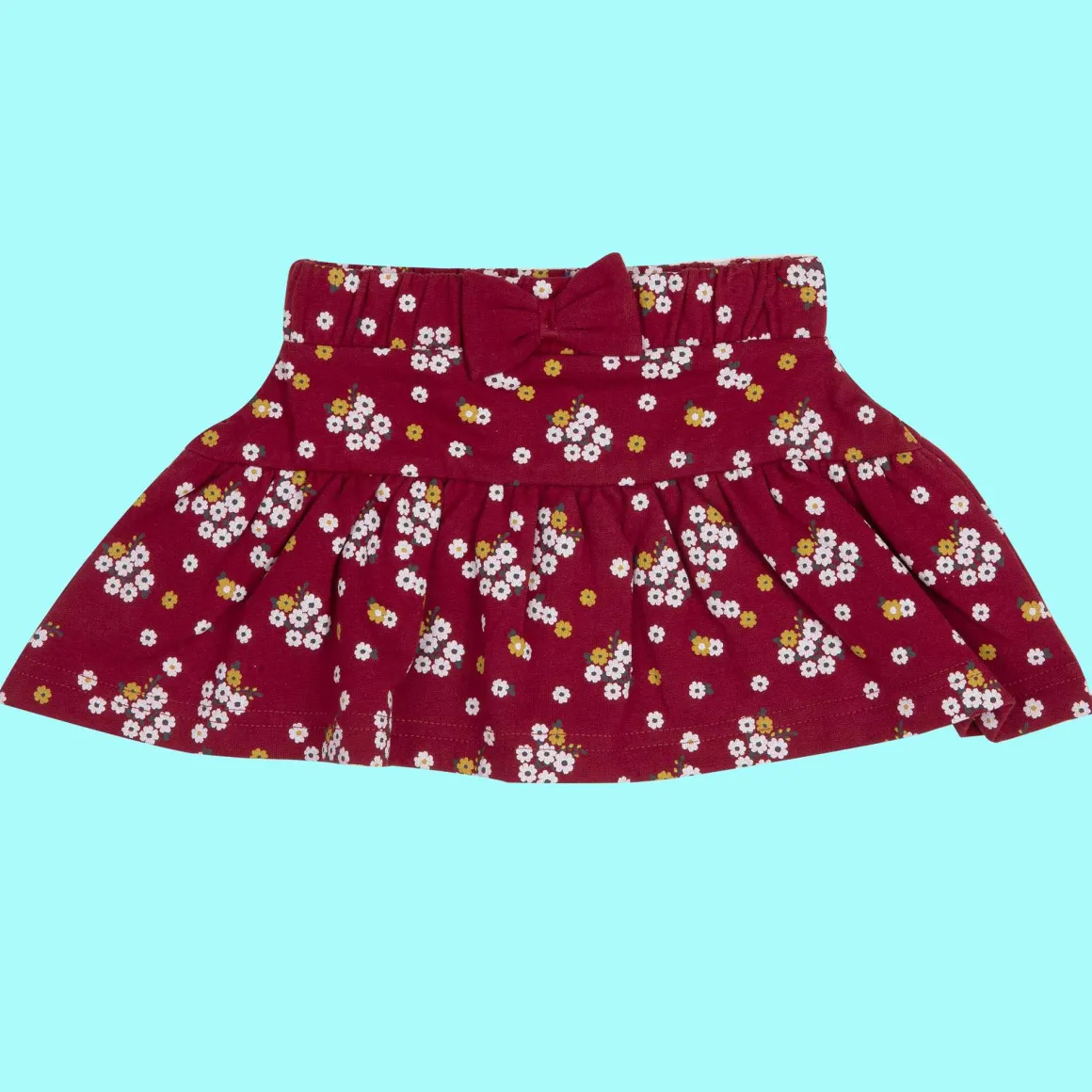 Gonna in morbida felpa stretch in colore bordeaux con baschina e balza arricciata e stampa fiorellini multicolore. Ad impreziosire la gonnellina un fiocchetto applicato in vita.La vita elastcizzata rende confortevole il capo e adatto ad ogni occasione.