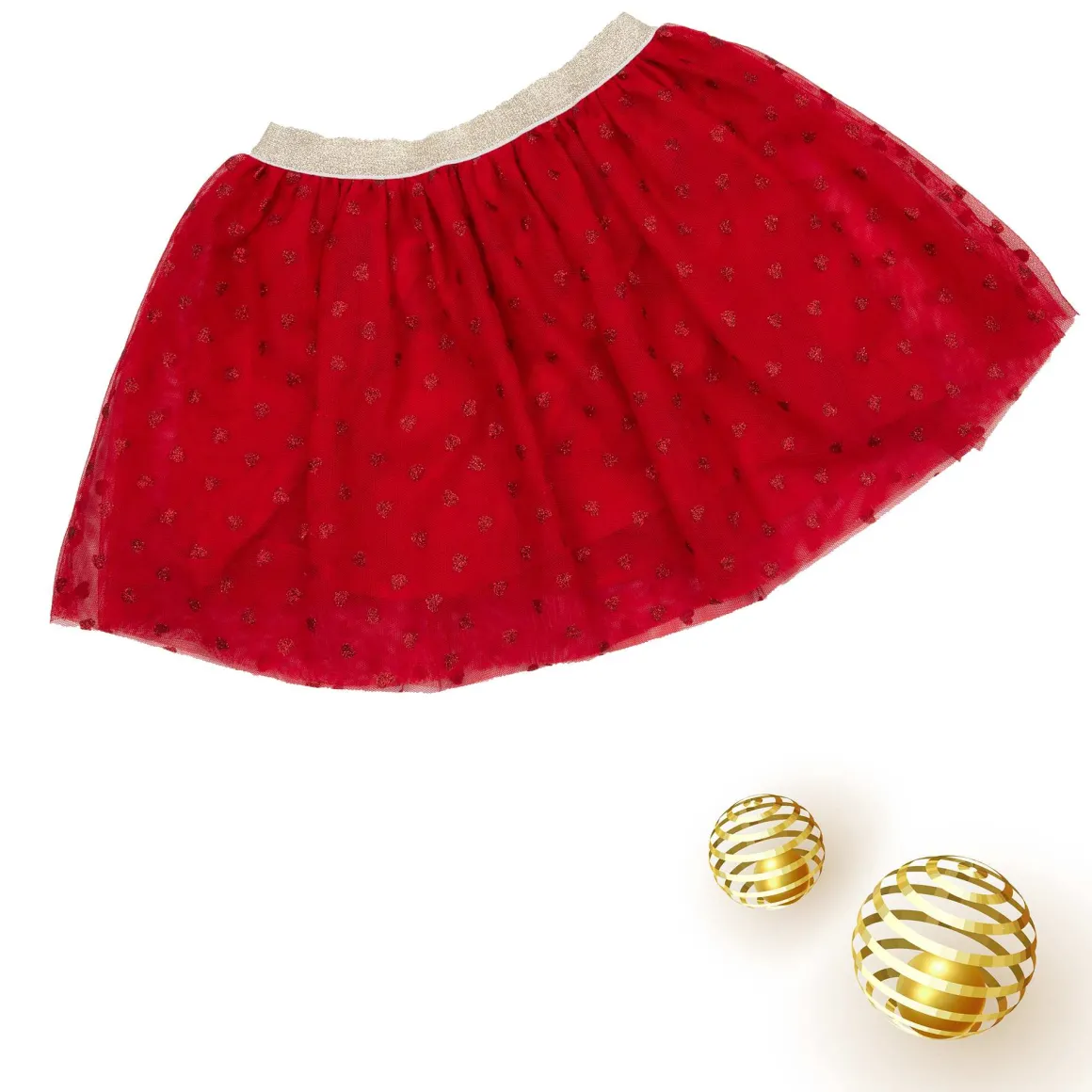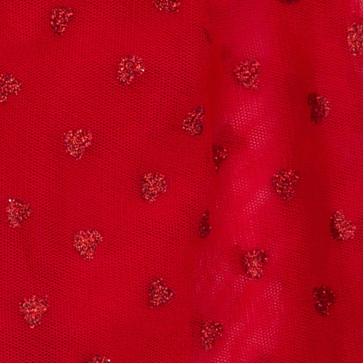 Gonna in caldo cotone con strati di tulle rosso, arricchiti con stampa cuoricini in glitter in tono. La cinturetta elasticizzata è impreziosita da fili di lurex dorato, per le giornate di festa e le occasioni speciali.