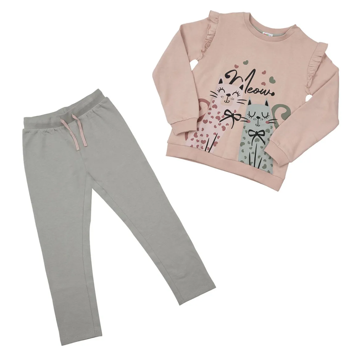 Completo jogging in morbida felpina bicolore con top con rouches e pantalone elasticato in vita, in colore rosa e verde salvia con stampa simpatici gattini.