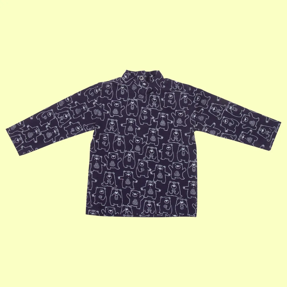 T-shirt collo a lupetto manica lunga in morbido cotone stretch in colore blu con stampa orsetti. L’apertura sul retro con bottoni a pressione facilita il passaggio testa. Disponibile in diverse varianti.