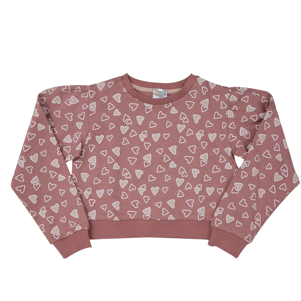 Maglia felpa in morbido cotone, vestibilità crop con stampa cuori nei toni dei rosa e morbide costine al fondo ed al collo.