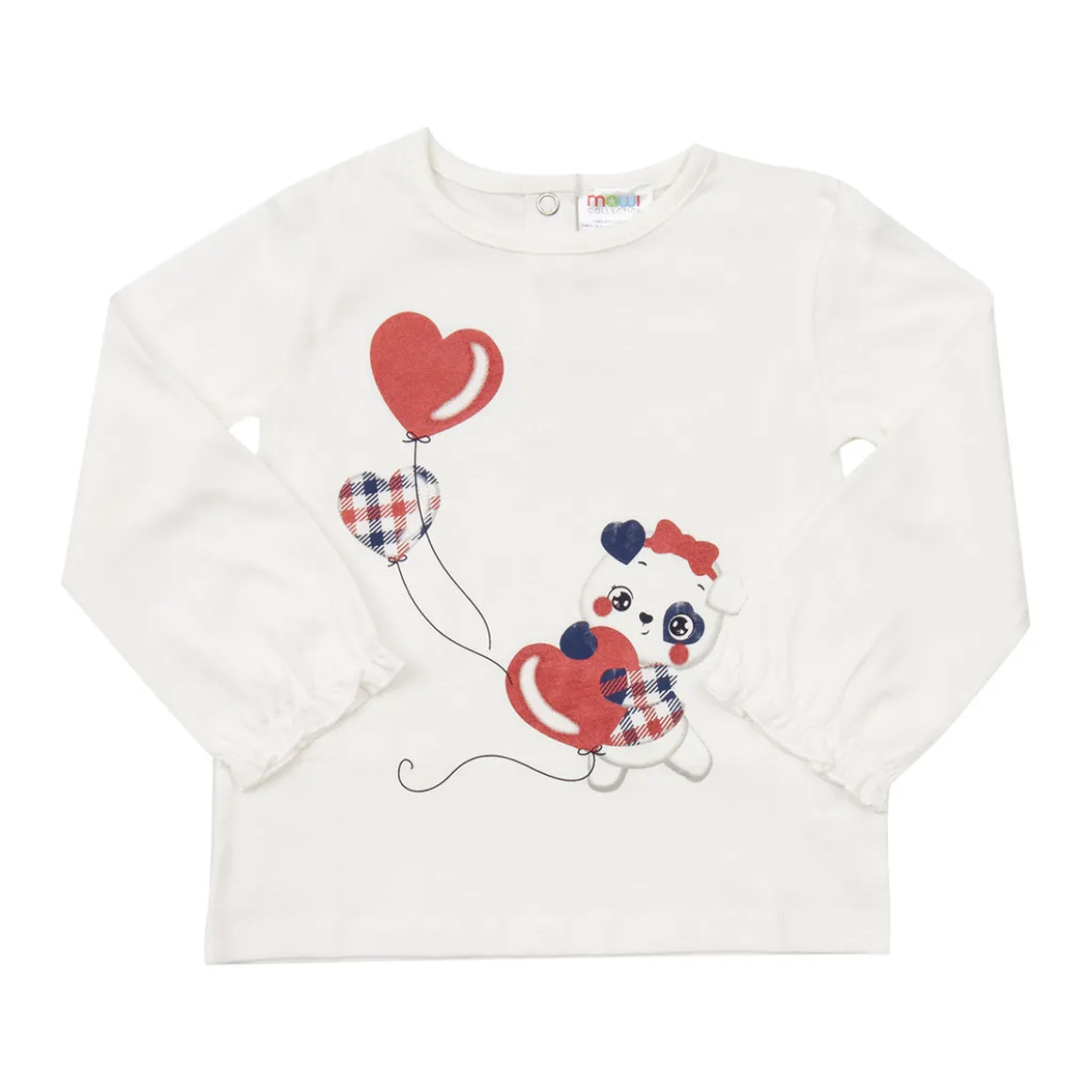 T-shirt manica lunga con polsini elasticizzati con rouches, in morbido cotone in colore panna con stampa. L’apertura sul retro con bottoni a pressione facilita il passaggio testa. Disponibile in diverse varianti.