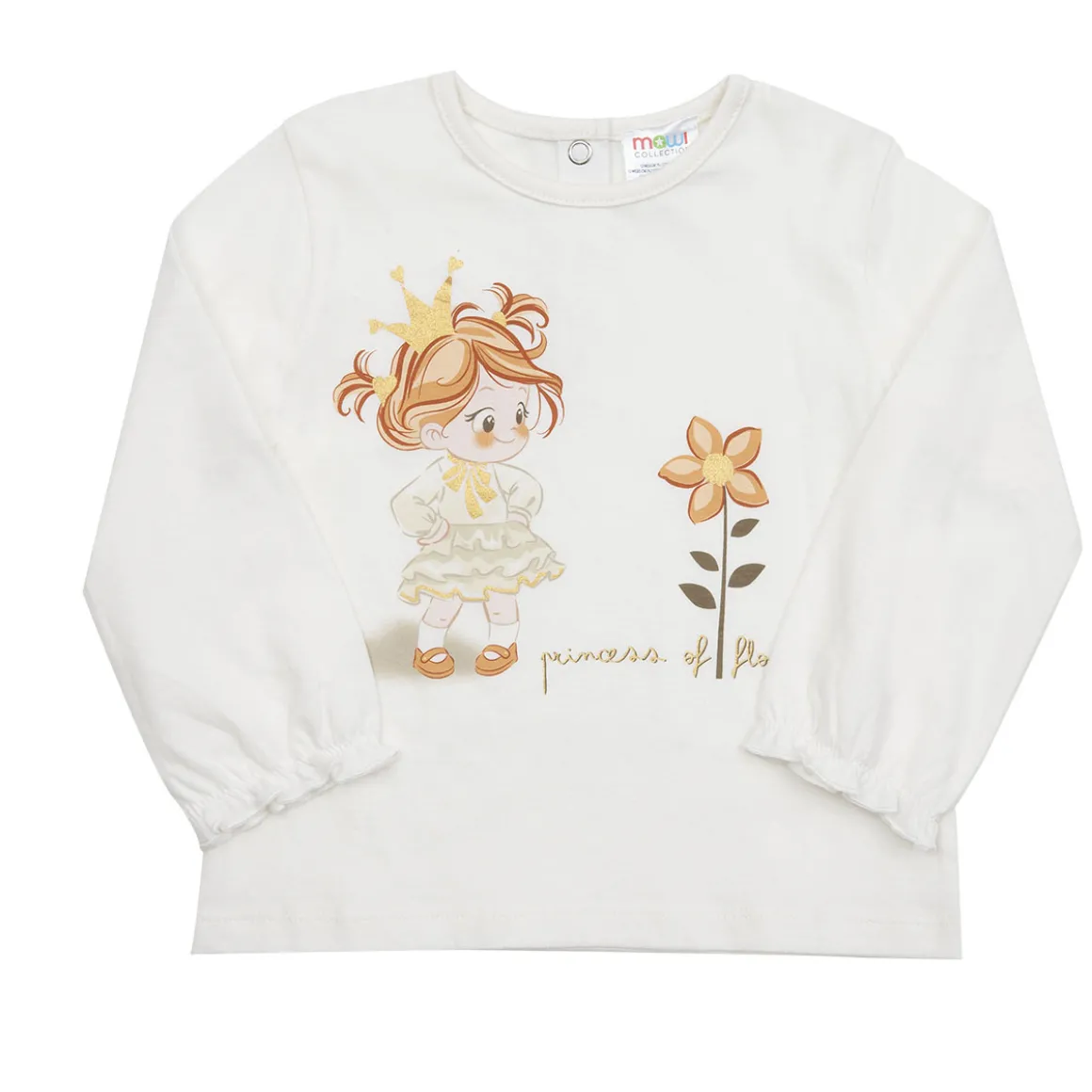 T-shirt manica lunga con polsini elasticizzati con rouches, in morbido cotone in caldo colore panna con stampa. L’apertura sul retro con bottoni a pressione facilita il passaggio testa. Disponibile in diverse varianti.