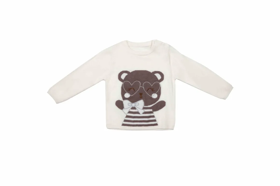 Morbida maglia tricot in viscosa in colore rosa con intarsio cagnolino e cuoricini beige. Adatta alle fredde giornate invernali. Con l’apertura sulla spalla con bottoncini, rende facilitato il passaggio testa.
