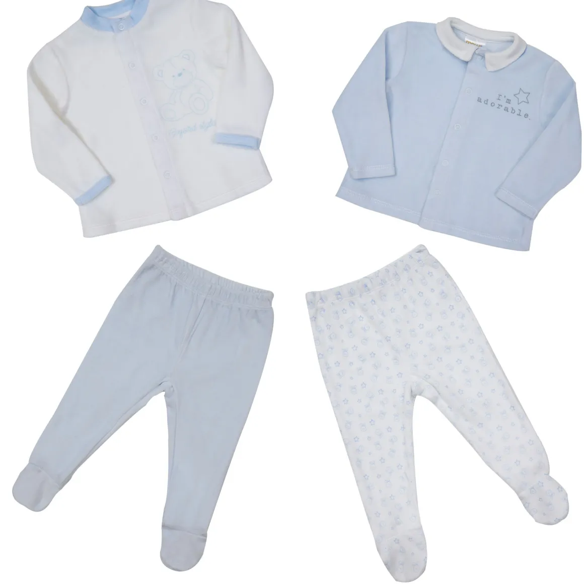 competo in cingila composto da coprifasce manica lunga e ghettina aperta avanti. Il pack è composto da due ghette una bianca con stampa orsetto e una azzurra con scritta i’m adorable da abbinare alle ghettine con stampa nuvolette su fondo bianco o in tinta unita azzurra