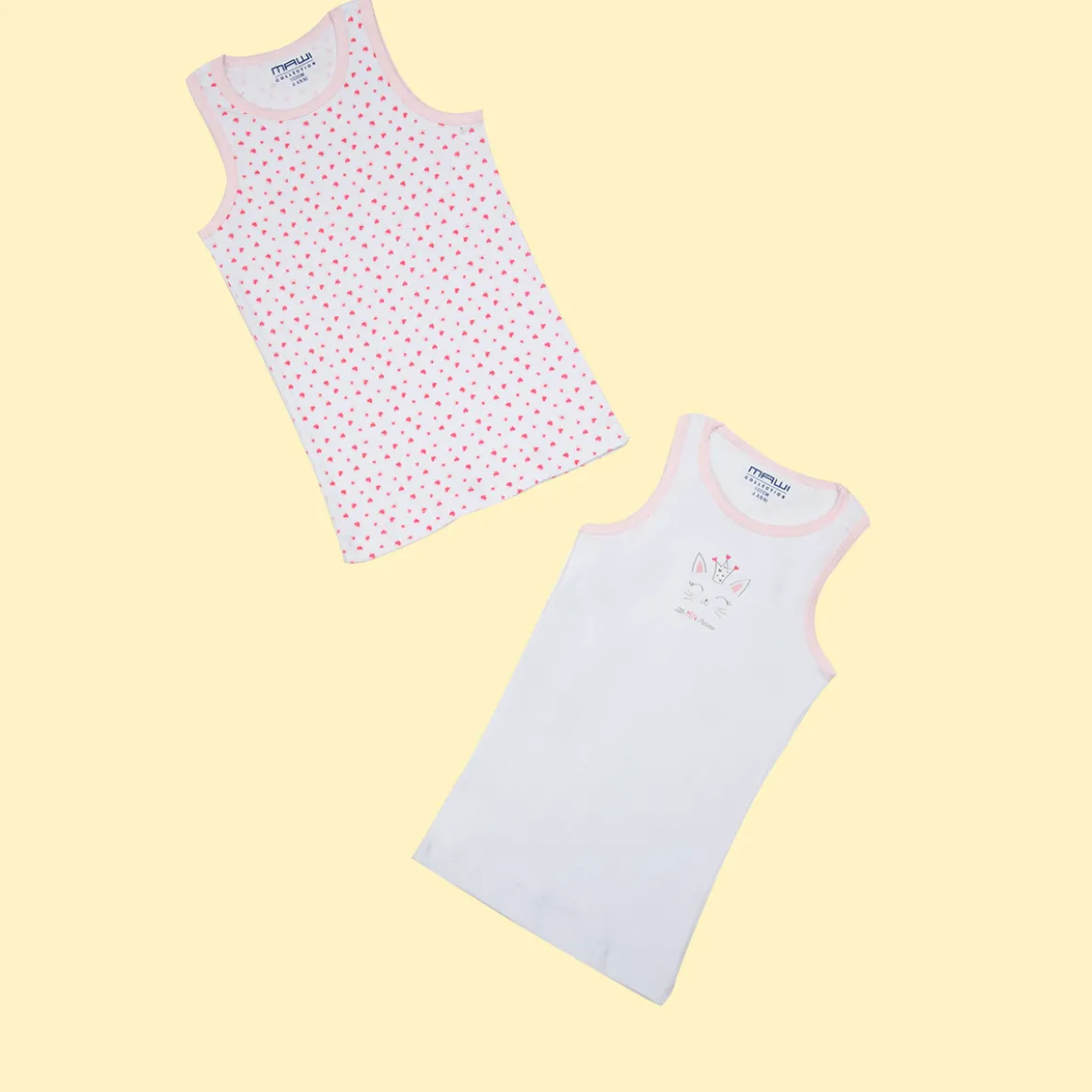 Il pack intimo indispensabile per il guardaroba della tua bambina, è composto da 2 canottiere in costina 100% cotone con vestibilità a spalla larga. La prima ha una piccola stampa con una dolce gattina , la seconda è a fantasia cuori. Disponibili anche in diversi colori e fantasie.