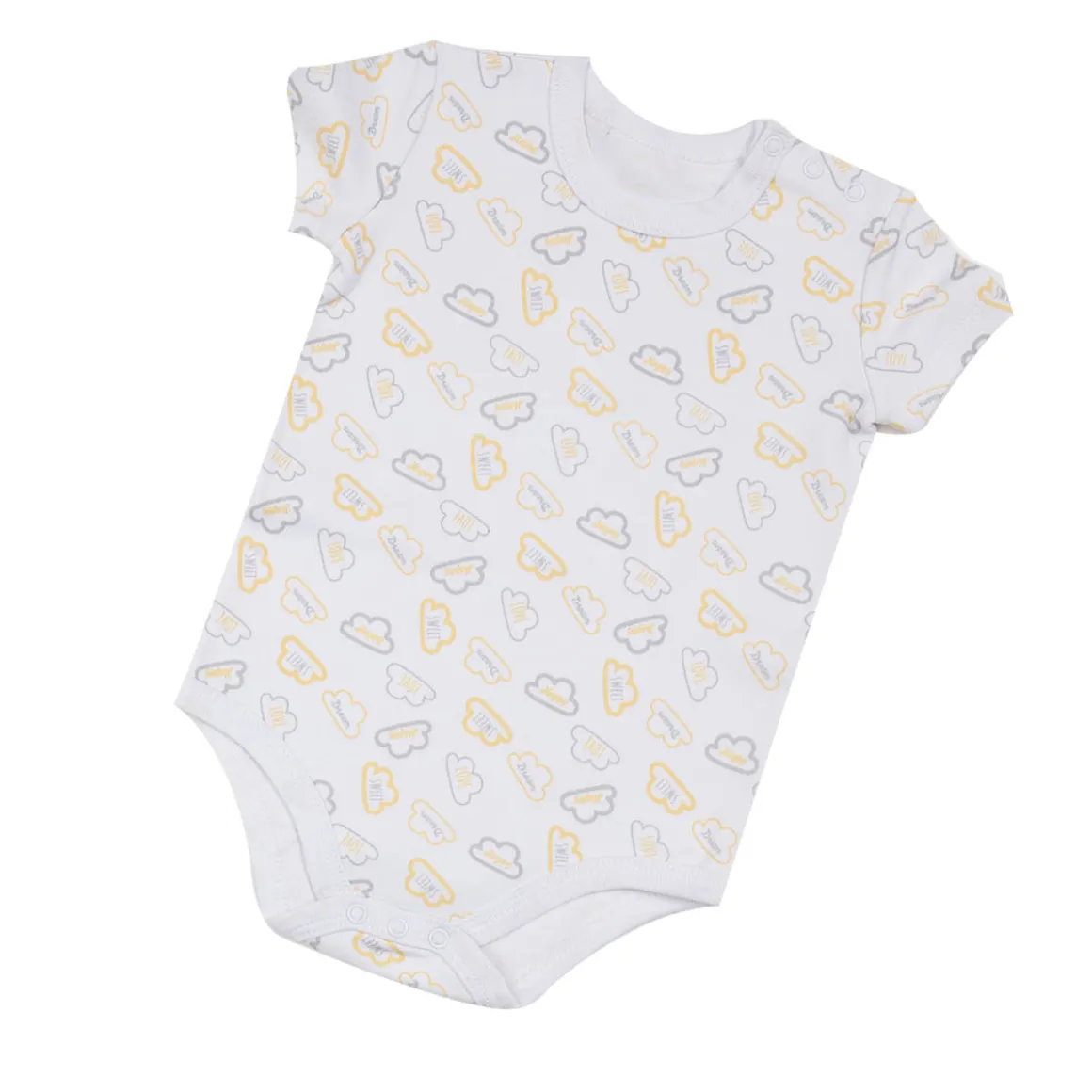 Set di 3 body unisex manica corta in caldo cotone sui toni giallo bianco e grigio . Fantasia simpatiche nuvolette e scritte. L’apertura su spalla e l’apertura con bottoni a pressione sul cavallo facilitano il cambio del pannolino e la vestizione. Modello certifiato oeko-tex