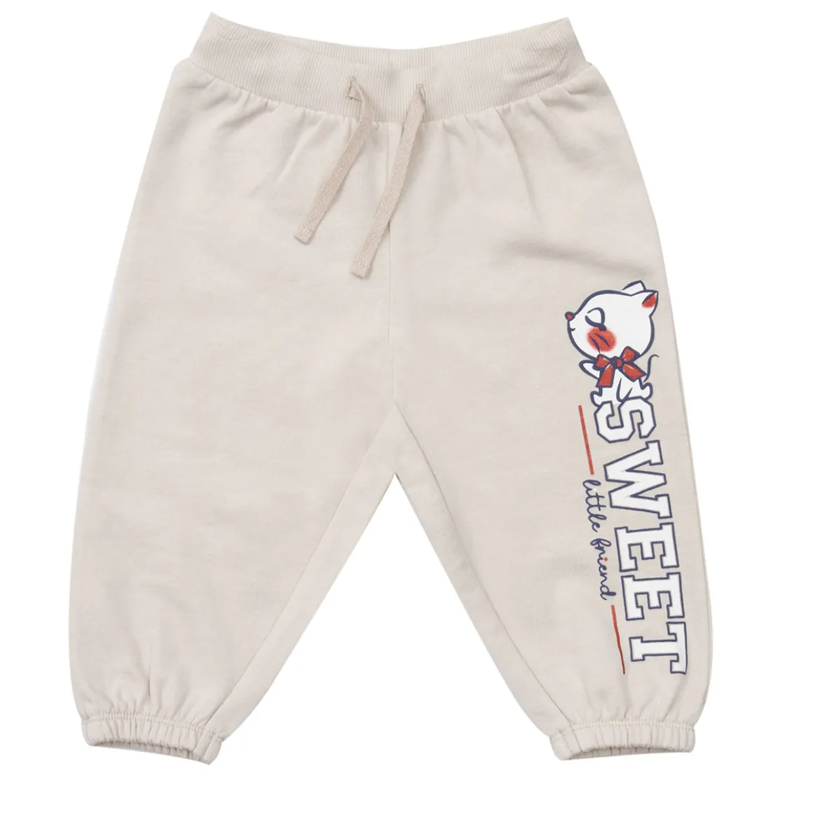 Pantalone in felpa con stampa e morbida elasticatura al fondo gamba. La vita in costina rende confortevole indossare il capo.