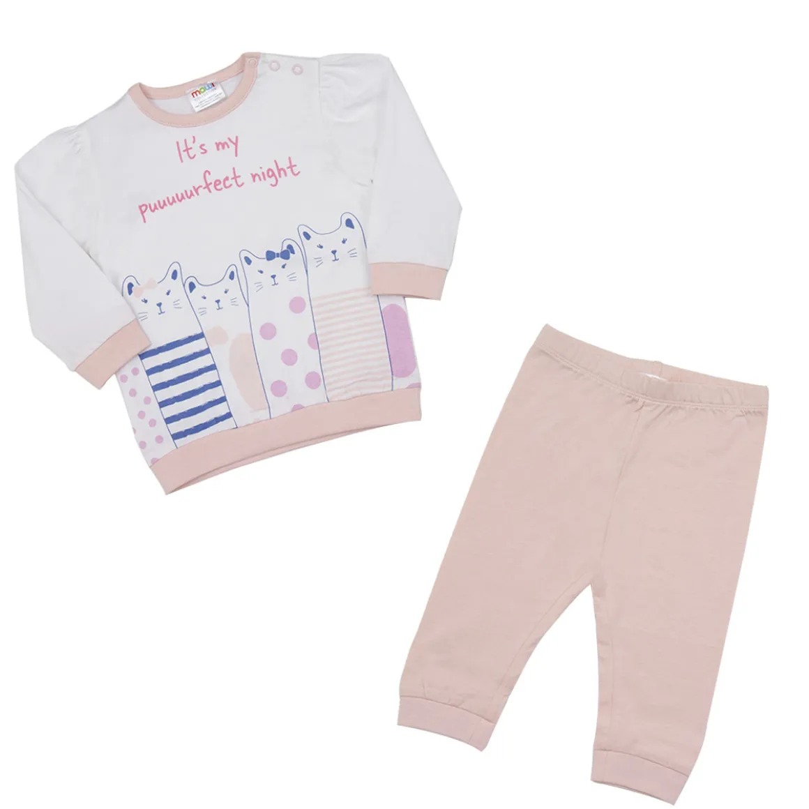 Pigiama in morbido cotone, bicolore con stampa gattini. L’apertura sulla spalla e le morbide costine conferiscono maggior comfort al capo.