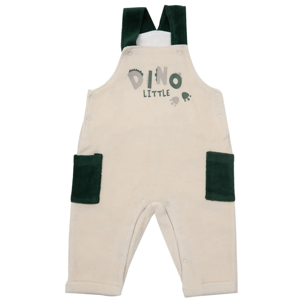 Deliziosa salopette in morbida ciniglia beige con dettagli verde brillante. Impreziosito da tasche in contrasto e divertente stampa sulla pettorina. Chiusura bretelle adattabile e motivo risvolto a fondo gamba. Coordinabile con i body dello stesso tema per un outfit davvero modaiolo.
